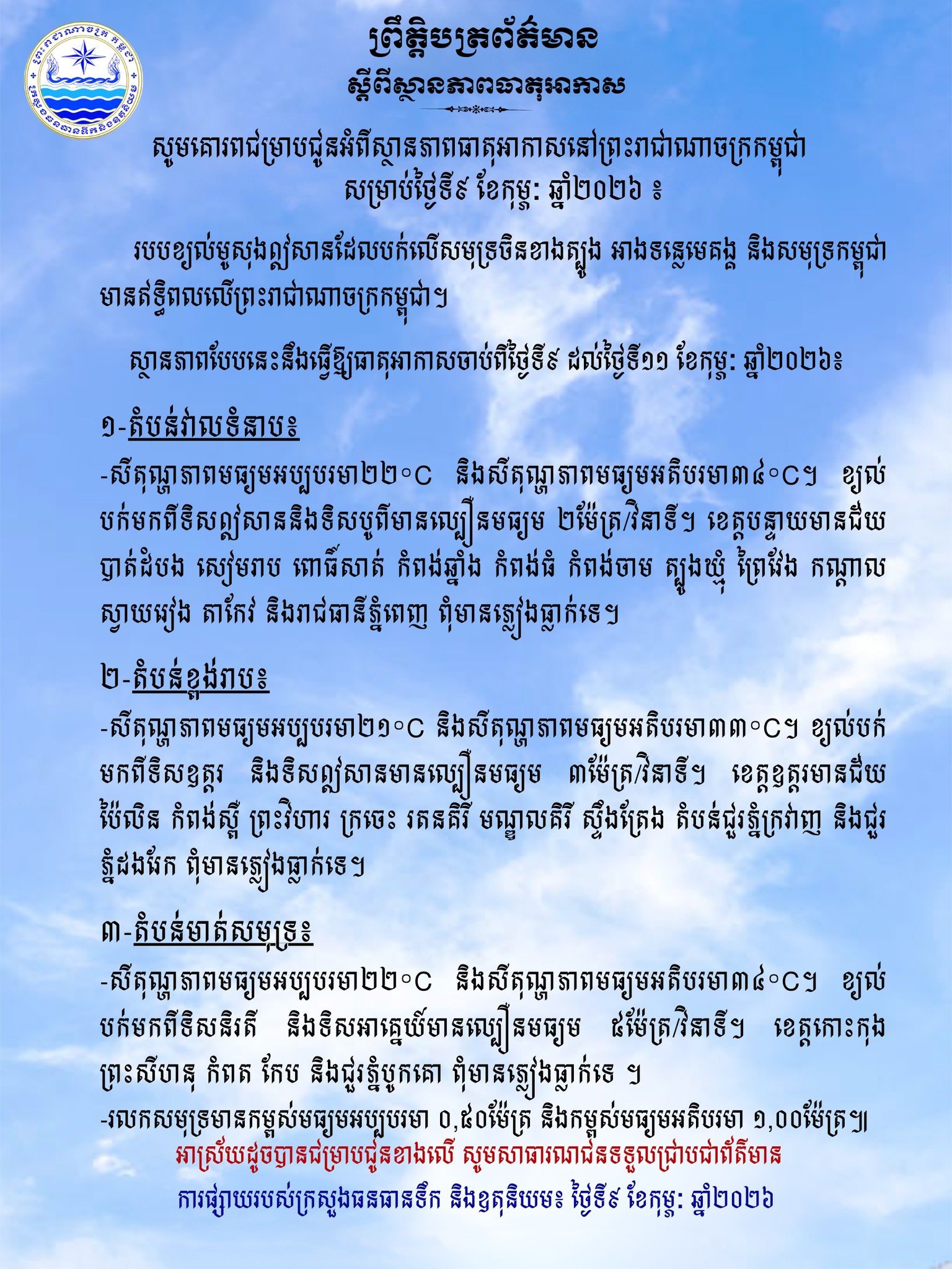 រាជធានីភ្នំពេញ៖ ក្រសួងធនធានទឹក និងឧតុនិយម បានឱ្យដឹងថាចាប់ពីថ្ងៃទី៩ ដល់ថ្ងៃទី១១ ខែកុម្ភៈ ឆ្នាំ២០២៦ នេះកម្ពុជានឹងគ្របដណ្ដប់ដោយផ្ទៃមេឃស្រឡះល្អ និងគ្មានភ្លៀងនៅទូទាំងប្រទេស។