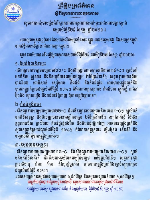ក្រសួងធនធានទឹកជូនដំណឹងអំពីស្ថានភាពធាតុអាកាសនៅកម្ពុជាសម្រាប់ថ្ងៃទី២៥ ខែកុម្ភៈ ឆ្នាំ២០២៦ February 25, 2026February 25, 2026 - by Nhan Syim - Leave a Comment (ភ្នំពេញ)៖ ក្រសួងធនធានទឹក និងឧតុនិយម បានចេញសេចក្តីជូនដំណឹង អំពីស្ថានភាពធាតុអាកាសនៅកម្ពុជា សម្រាប់ថ្ងៃទី២៥ ខែកុម្ភៈ ឆ្នាំ២០២៦។ ខាងក្រោមនេះ ជាសេចក្តីជូនដំណឹងរបស់ក្រសួងធនធានទឹក៖