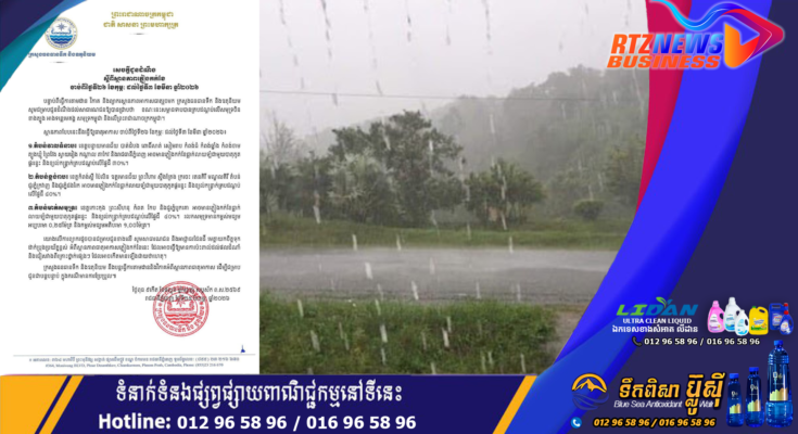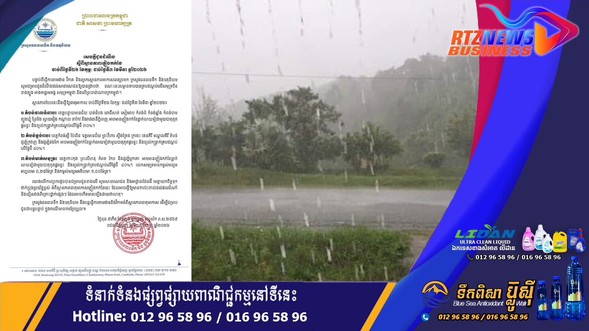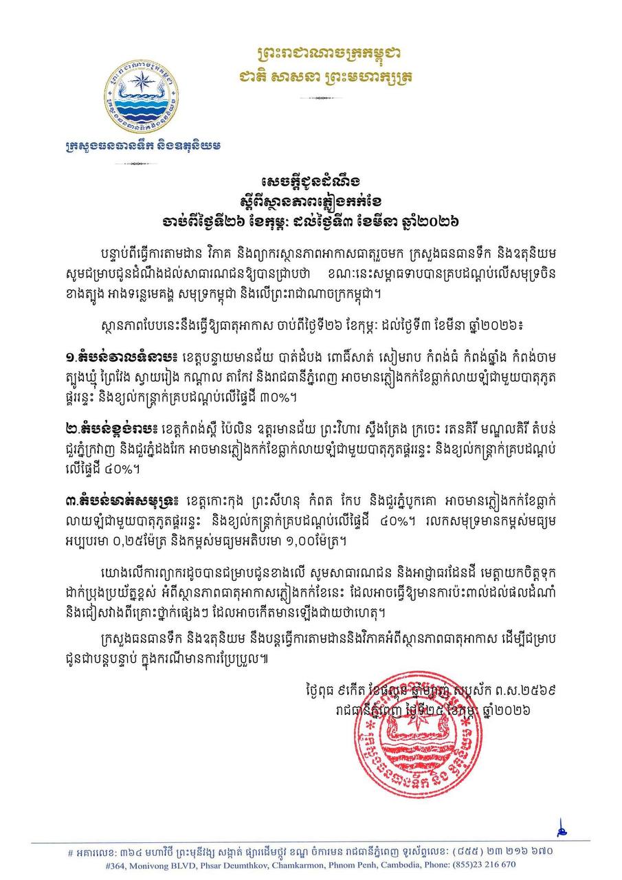 ក្រសួងធនធានទឹក៖ កម្ពុជានឹងមានភ្លៀងកក់ខែចាប់ពីថ្ងៃទី២៦ ខែកុម្ភៈ ដល់ថ្ងៃទី៣ ខែមីនា ឆ្នាំ២០២៦ February 25, 2026 - by Nhan Syim - Leave a Comment ក្រសួងធនធានទឹកនិងឧតុនិយមសូមជម្រាបជូនដំណឹងដល់សាធារណជនស្តីពីស្ថានភាពភ្លៀងកក់ខែ ចាប់ពីថ្ងៃទី២៦ ខែកុម្ភៈ ដល់ថ្ងៃទី៣ ខែមីនា ឆ្នាំ២០២៦៕