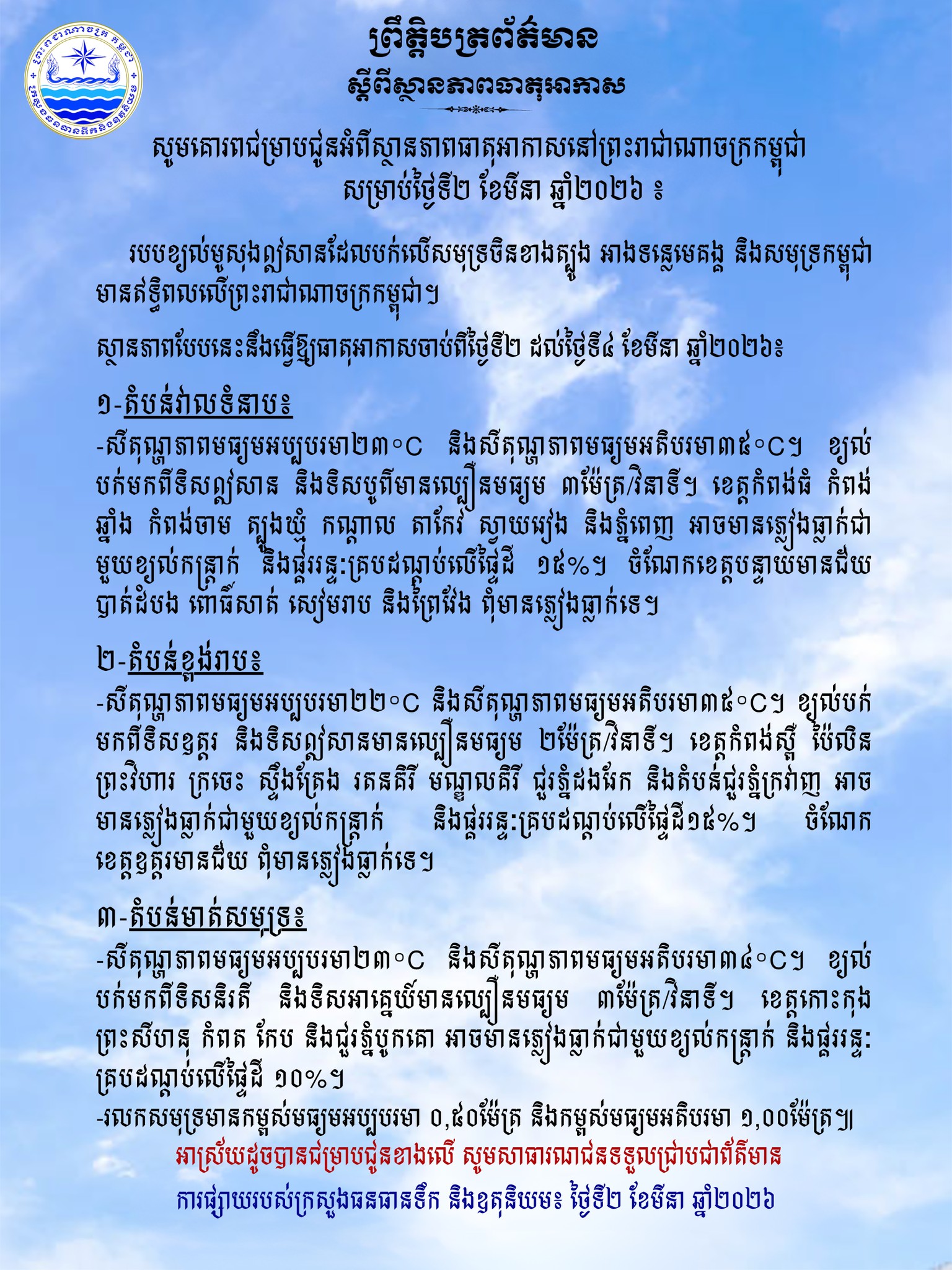 ក្រសួងធនធានទឹកជូនដំណឹងអំពីស្ថានភាពធាតុអាកាសនៅកម្ពុជា សម្រាប់ថ្ងៃទី២ ខែមីនា ឆ្នាំ២០២៦ March 2, 2026 - by Nhan Syim - Leave a Comment (ភ្នំពេញ)៖ ក្រសួងធនធានទឹកនិងឧតុនិយមបានចេញសេចក្តីជូនដំណឹង អំពីស្ថានភាពធាតុអាកាសនៅកម្ពុជា សម្រាប់ថ្ងៃទី២ ខែមីនា ឆ្នាំ២០២៦។ ខាងក្រោមនេះជាសេចក្តីជូនដំណឹងរបស់ក្រសួងធនធានទឹក៖