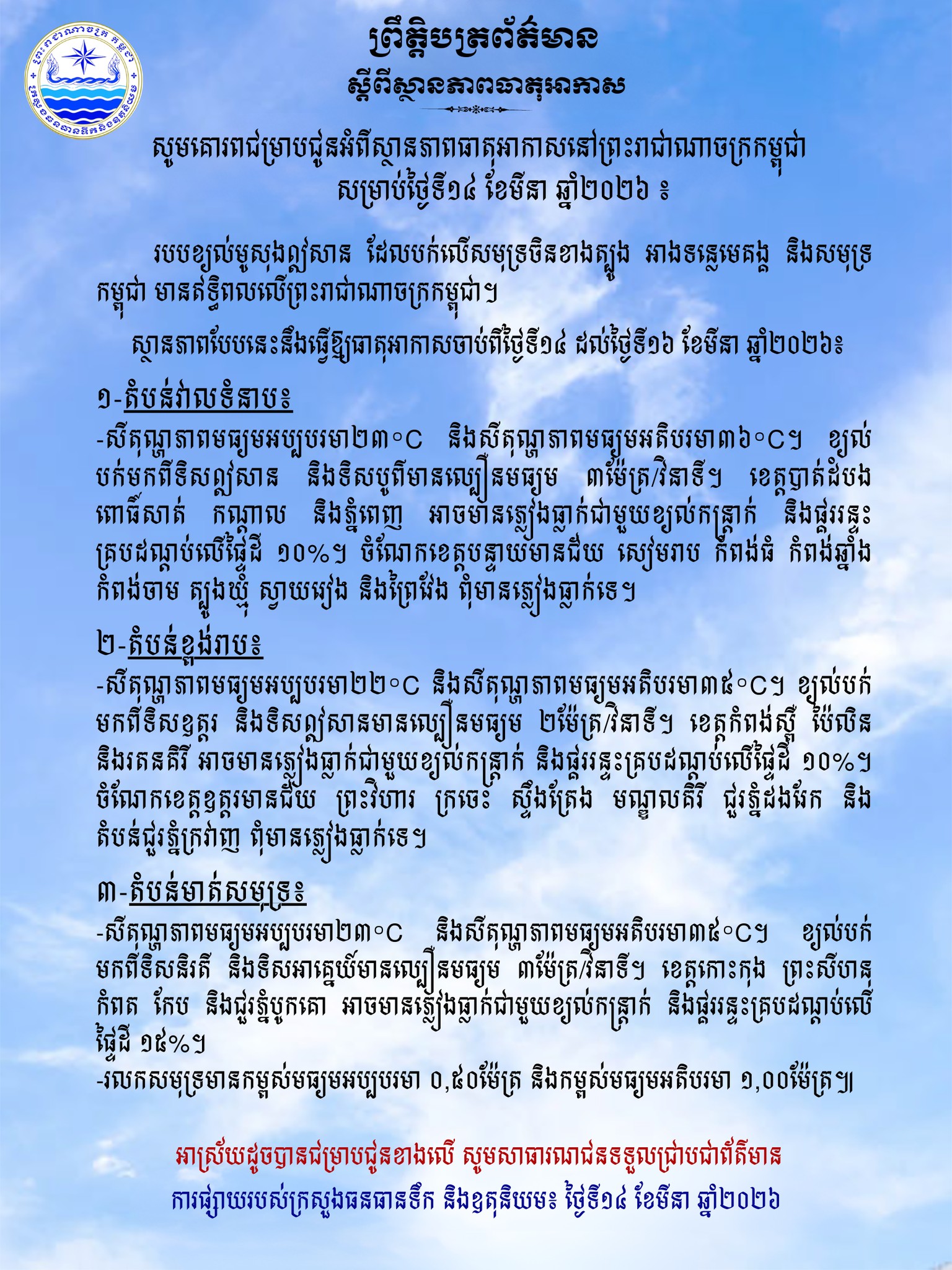 ក្រសួងធនធានទឹកជូនដំណឹងអំពីស្ថានភាពធាតុអាកាសនៅកម្ពុជា សម្រាប់ថ្ងៃទី១៤ ខែមីនា ឆ្នាំ២០២៦ March 14, 2026 - by Nhan Syim - Leave a Comment (ភ្នំពេញ)៖ ក្រសួងធនធានទឹកនិងឧតុនិយមបានចេញសេចក្តីជូនដំណឹង អំពីស្ថានភាពធាតុអាកាសនៅកម្ពុជា សម្រាប់ថ្ងៃទី១៤ ខែមីនា ឆ្នាំ២០២៦។ ខាងក្រោមនេះជាសេចក្តីជូនដំណឹងរបស់ក្រសួងធនធានទឹក៖