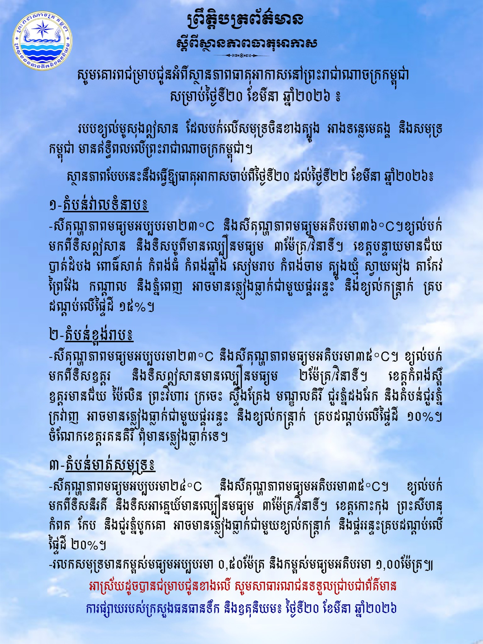 ក្រសួងធនធានទឹកជូនដំណឹងអំពីស្ថានភាពធាតុអាកាសនៅកម្ពុជា សម្រាប់ថ្ងៃទី២០ ខែមីនា ឆ្នាំ២០២៦ March 20, 2026 - by Nhan Syim - Leave a Comment (ភ្នំពេញ)៖ ក្រសួងធនធានទឹក និងឧតុនិយម បានចេញសេចក្តីជូនដំណឹង អំពីស្ថានភាពធាតុអាកាសនៅកម្ពុជា សម្រាប់ថ្ងៃទី២០ ខែមីនា ឆ្នាំ២០២៦។ ខាងក្រោមនេះជាសេចក្តីជូនដំណឹងរបស់ក្រសួងធនធានទឹក៖