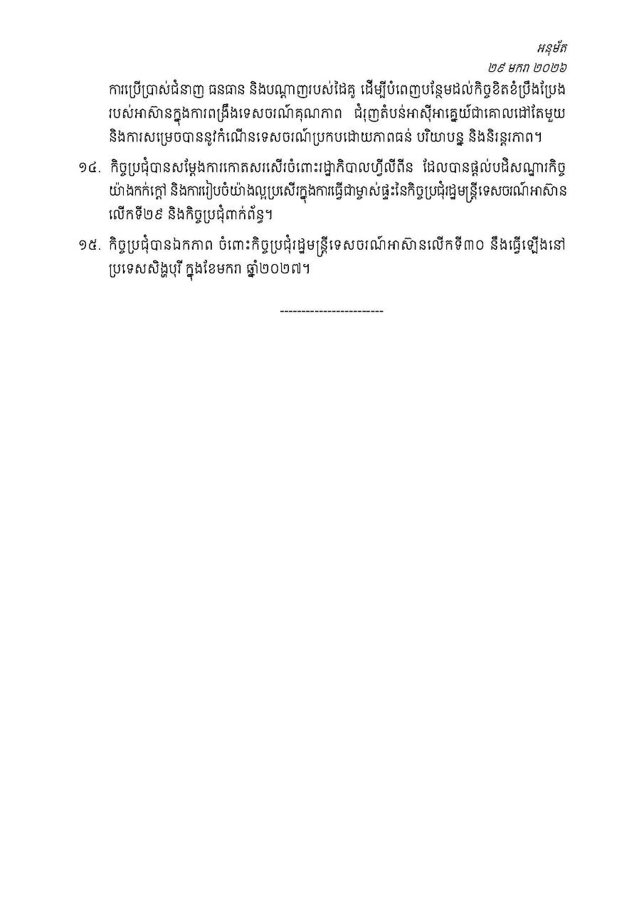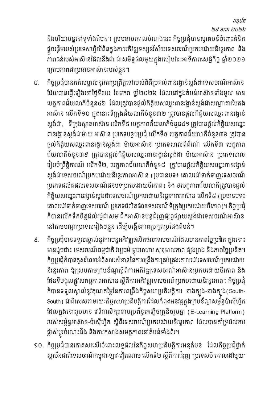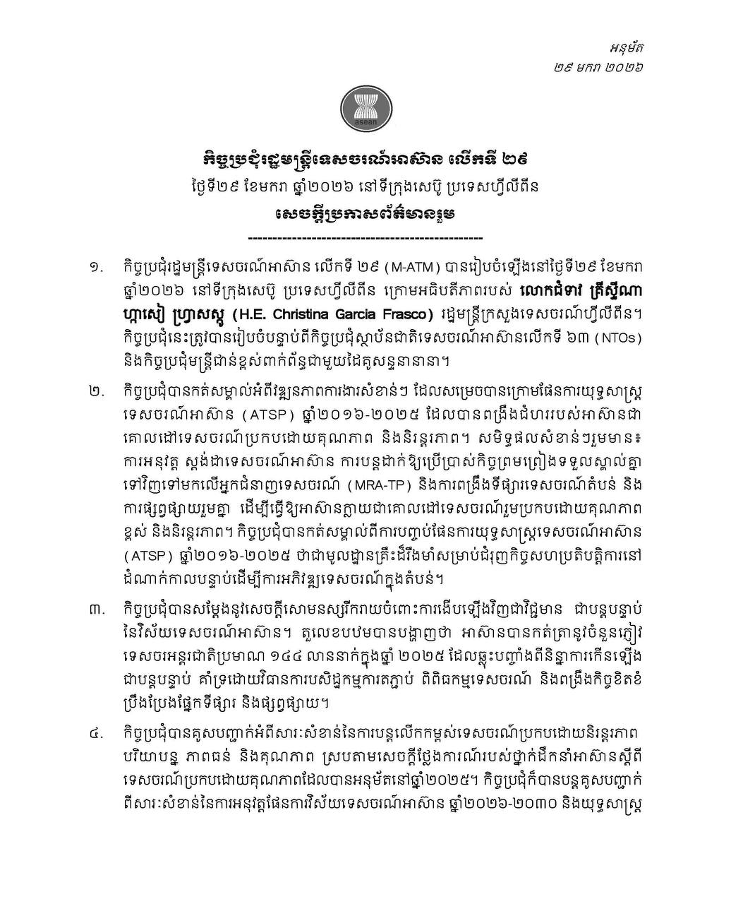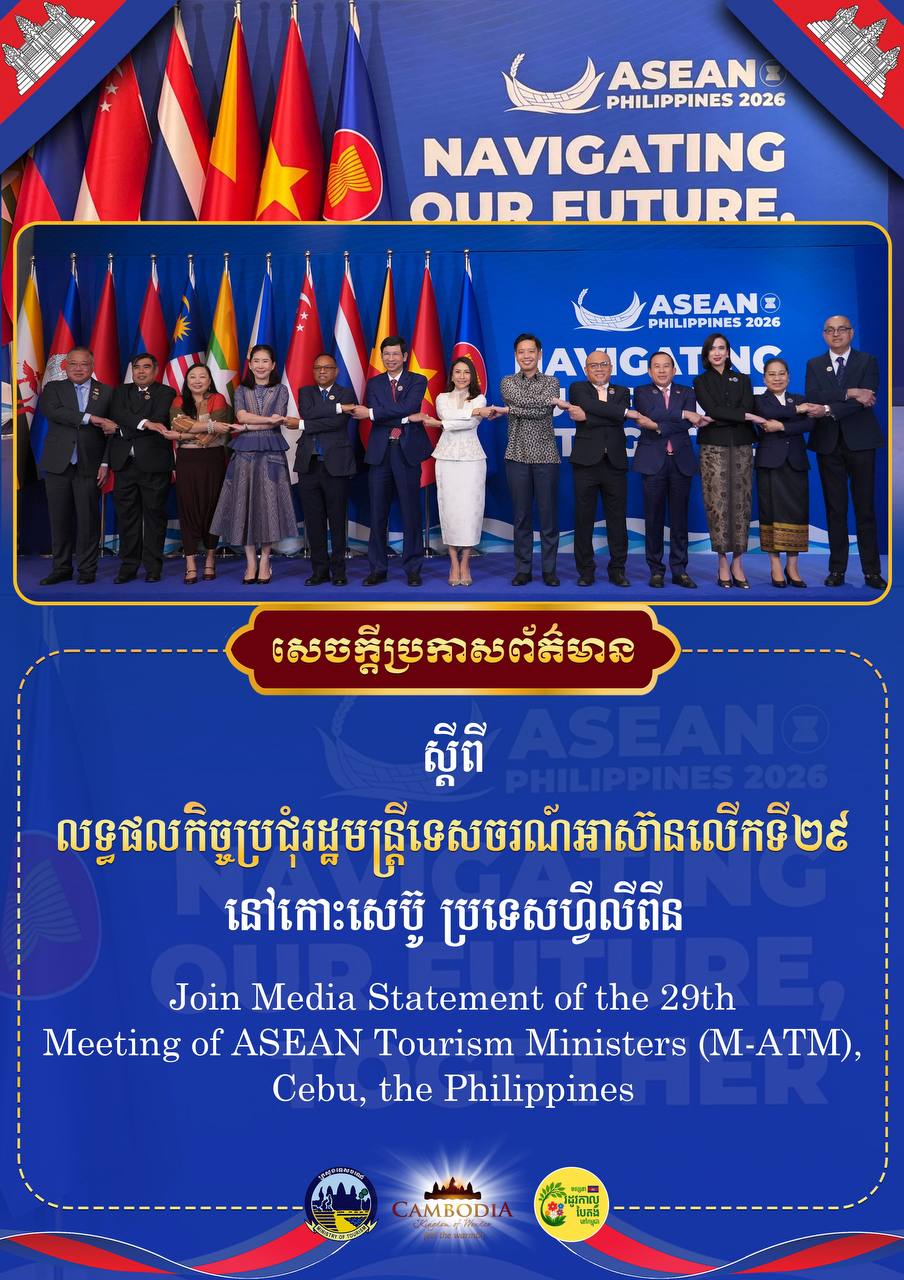 កិច្ចប្រជុំរដ្ឋមន្ត្រីទេសចរណ៍អាស៊ាន លើកទី ២៩ ថ្ងៃទី២៩ ខែមករា ឆ្នាំ២០២៦ នៅទីក្រុងសេប៊ូ ប្រទេសហ្វីលីពីន សេចក្តីប្រកាសព័ត៌មានរួម ១. កិច្ចប្រជុំរដ្ឋមន្ត្រីទេសចរណ៍អាស៊ាន លើកទី ២៩ (M-ATM) បានរៀបចំឡើងនៅថ្ងៃទី២៩ ខែមករា ឆ្នាំ២០២៦ នៅទីក្រុងសេប៊ូ ប្រទេសហ្វីលីពីន ក្រោមអធិបតីភាពរបស់ លោកជំទាវ គ្រីស្ទីណា ហ្គាសៀ ប្រាសស្កូ (H.E. Christina Garcia Frasco) រដ្ឋមន្ត្រីក្រសួងទេសចរណ៍ហ្វីលីពីន។ កិច្ចប្រជុំនេះត្រូវបានរៀបចំបន្ទាប់ពីកិច្ចប្រជុំស្ថាប័នជាតិទេសចរណ៍អាស៊ានលើកទី ៦៣ (NTOs) និងកិច្ចប្រជុំមន្ត្រីជាន់ខ្ពស់ពាក់ព័ន្ធជាមួយដៃគូសន្ទនានានា។ ២. កិច្ចប្រជុំបានកត់សម្គាល់អំពីវឌ្ឍនភាពការងារសំខាន់ៗ ដែលសម្រេចបានក្រោមផែនការយុទ្ធសាស្ត្រ ទេសចរណ៍អាស៊ាន (ATSP) ឆ្នាំ២០១៦-២០២៥ ដែលបានពង្រឹងជំហររបស់អាស៊ានជា គោលដៅទេសចរណ៍ប្រកបដោយគុណភាព និងនិរន្តរភាព។ សមិទ្ធផលសំខាន់ៗរួមមាន៖ ការអនុវត្ត ស្តង់ដាទេសចរណ៍អាស៊ាន ការបន្តដាក់ឱ្យប្រើប្រាស់កិច្ចព្រមព្រៀងទទួលស្គាល់គ្នា ទៅវិញទៅមកលើអ្នកជំនាញទេសចរណ៍ (MRA-TP) និងការពង្រឹងទីផ្សារទេសចរណ៍តំបន់ និង ការផ្សព្វផ្សាយរួមគ្នា ដើម្បីធ្វើឱ្យអាស៊ានក្លាយជាគោលដៅទេសចរណ៍រួមប្រកបដោយគុណភាព ខ្ពស់ និងនិរន្តរភាព។ កិច្ចប្រជុំបានកត់សម្គាល់ពីការបញ្ចប់ផែនការយុទ្ធសាស្ត្រទេសចរណ៍អាស៊ាន (ATSP) ឆ្នាំ២០១៦-២០២៥ ថាជាមូលដ្ឋានគ្រឹះដ៏រឹងមាំសម្រាប់ជំរុញកិច្ចសហប្រតិបត្តិការនៅ ដំណាក់កាលបន្ទាប់ដើម្បីការអភិវឌ្ឍទេសចរណ៍ក្នុងតំបន់។ ៣. កិច្ចប្រជុំបានសម្តែងនូវសេចក្តីសោមនស្សរីករាយចំពោះការងើបឡើងវិញជាវិជ្ជមាន ជាបន្តបន្ទាប់ នៃវិស័យទេសចរណ៍អាស៊ាន។ តួលេខបឋមបានបង្ហាញថា អាស៊ានបានកត់ត្រានូវចំនួនភ្ញៀវ ទេសចរអន្តរជាតិប្រមាណ ១៤៤ លាននាក់ក្នុងឆ្នាំ ២០២៥ ដែលឆ្លុះបញ្ចាំងពីនិន្នាការកើនឡើង ជាបន្តបន្ទាប់ គាំទ្រដោយវិធានការបសិដ្ឋកម្មការតភ្ជាប់ ពិពិធកម្មទេសចរណ៍ និងពង្រឹងកិច្ចខិតខំ ប្រឹងប្រែងផ្នែកទីផ្សារ និងផ្សព្វផ្សាយ។ ៤. កិច្ចប្រជុំបានគូសបញ្ជាក់អំពីសារៈសំខាន់នៃការបន្តលើកកម្ពស់ទេសចរណ៍ប្រកបដោយនិរន្តរភាព បរិយាបន្ន ភាពធន់ និងគុណភាព ស្របតាមសេចក្តីថ្លែងការណ៍របស់ថ្នាក់ដឹកនាំអាស៊ានស្តីពី ទេសចរណ៍ប្រកបដោយគុណភាពដែលបានអនុម័តនៅឆ្នាំ២០២៥។ កិច្ចប្រជុំក៏បានបន្តគូសបញ្ជាក់ ពីសារៈសំខាន់នៃការអនុវត្តផែនការវិស័យទេសចរណ៍អាស៊ាន ឆ្នាំ២០២៦-២០៣០ និងយុទ្ធសាស្ត្រទីផ្សារទេសចរណ៍អាស៊ាន ឆ្នាំ២០២៦-២០៣០ ដើម្បីដឹកនាំសកម្មភាពរួមគ្នា ពង្រឹងការកសាង កិត្តិនាម និងបង្កើនការផ្សព្វផ្សាយទេសចរណ៍តំបន់អាស៊ាន ក្នុងឆ្នាំខាងមុខបន្តបន្ទាប់។ ៥. កិច្ចប្រជុំបានលើកទឹកចិត្តដល់កិច្ចខិតខំប្រឹងប្រែងឥតឈប់ឈរ ដើម្