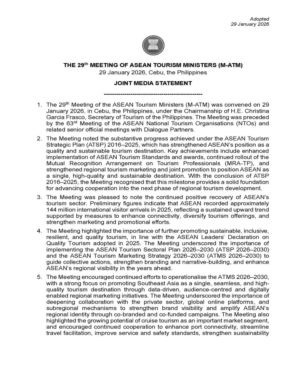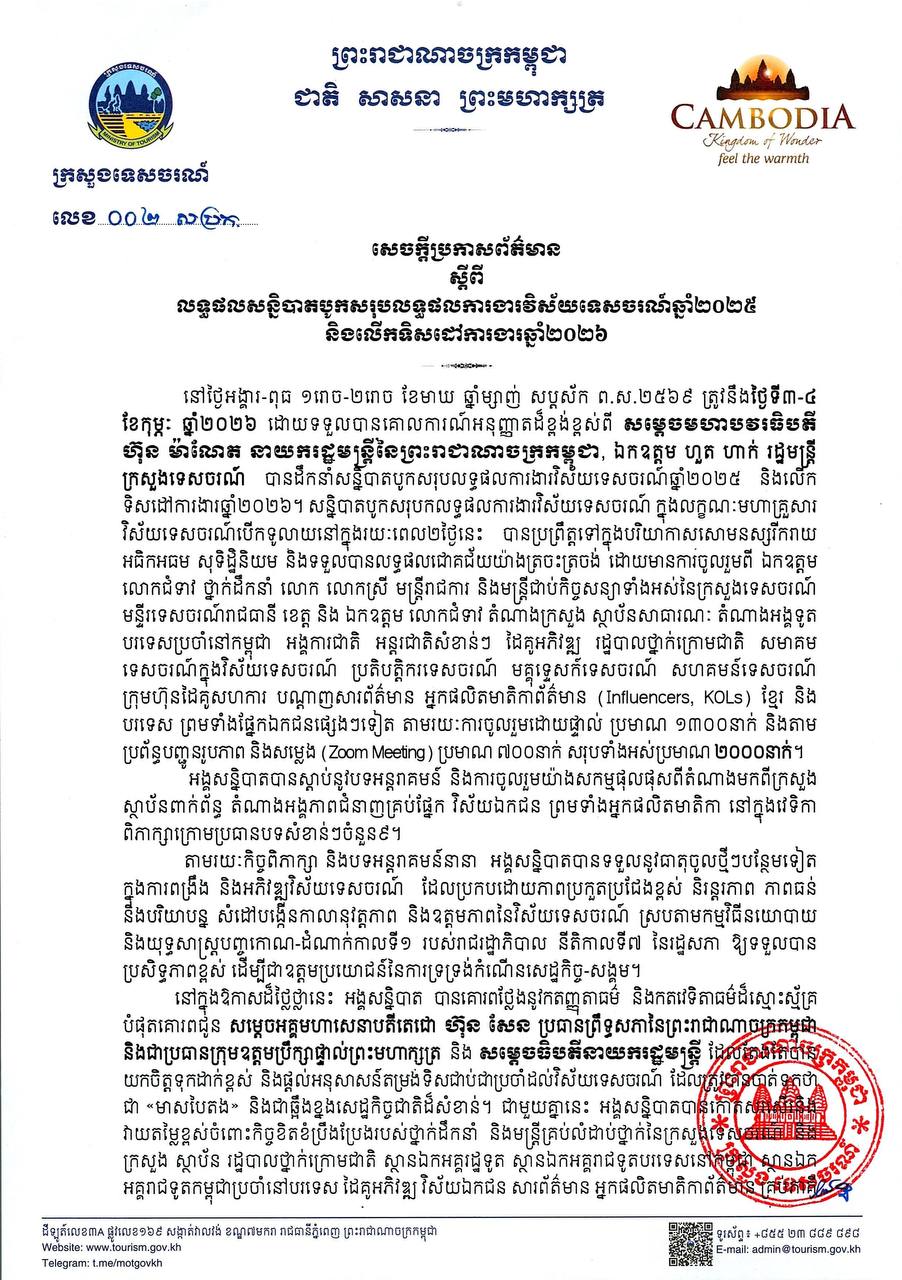 សេចក្តីប្រកាសព័ត៌មាន ស្តីពីលទ្ធផលសន្និបាតបូកសរុបលទ្ធផលការងារវិស័យទេសចរណ៍ឆ្នាំ២០២៥ និងលើកទិសដៅការងារឆ្នាំ២០២៦