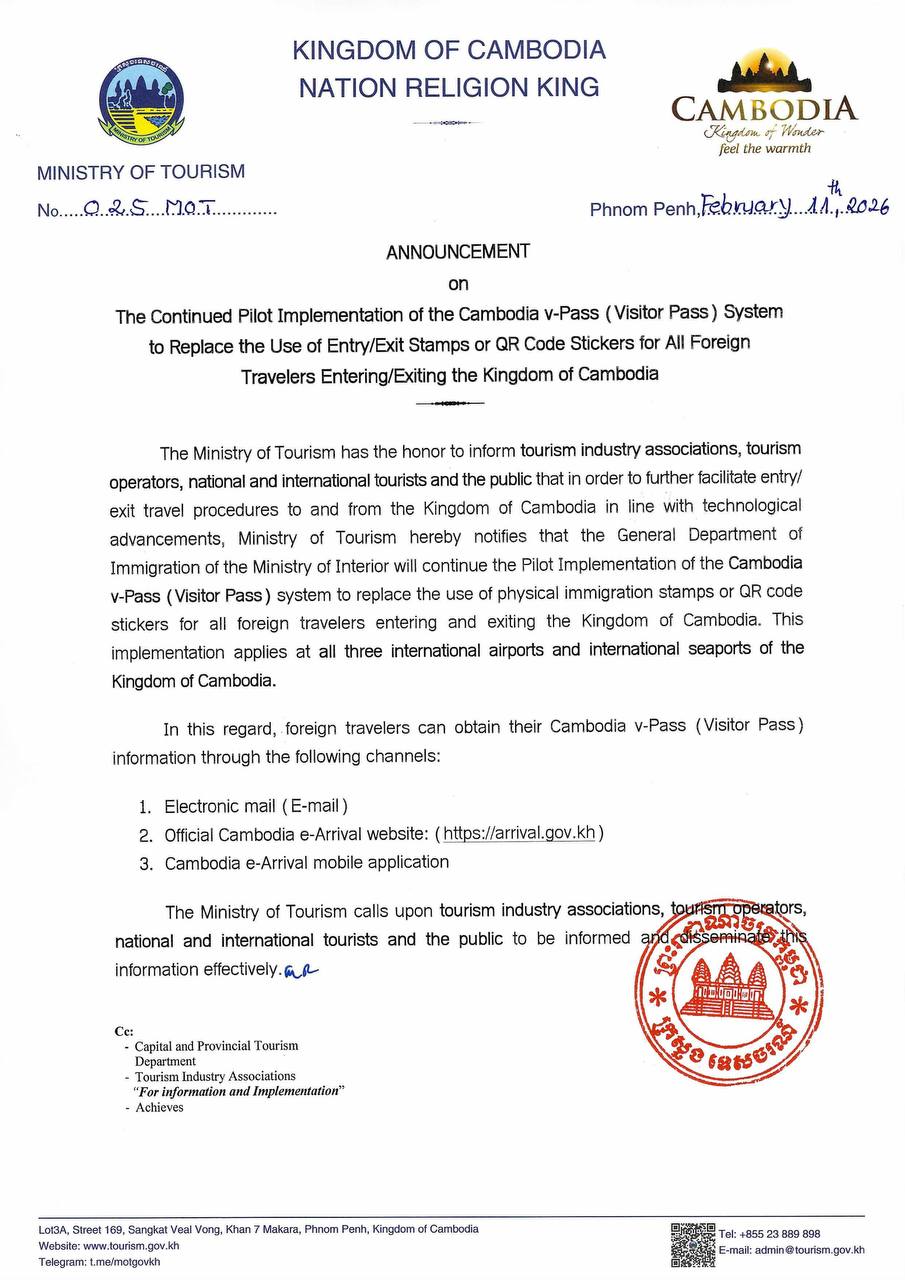 ANNOUNCEMENT on The Continued Pilot Implementation of the Cambodia v-Pass (Visitor Pass) System to Replace the Use of Entry/Exit Stamps or QR Code Stickers for All Foreign Travelers Entering/Exiting the Kingdom of Cambodia.