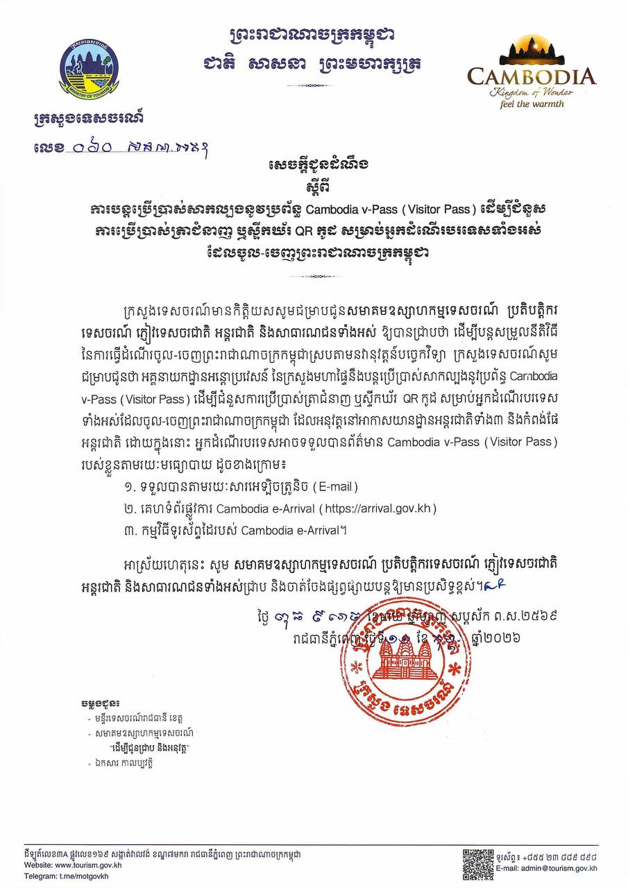 សេចក្តីជូនដំណឹង ស្តីពីការបន្តប្រើប្រាស់សាកល្បងនូវប្រព័ន្ធ Cambodia v-Pass (Visitor Pass) ដើម្បីជំនួសការប្រើប្រាស់ត្រាជំនាញ ឬស្ទីកឃ័រ QR កូដ សម្រាប់អ្នកដំណើរបរទេសទាំងអស់ដែលចូល-ចេញព្រះរាជាណាចក្រកម្ពុជា