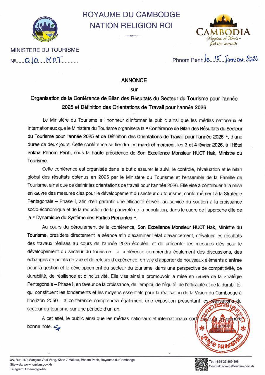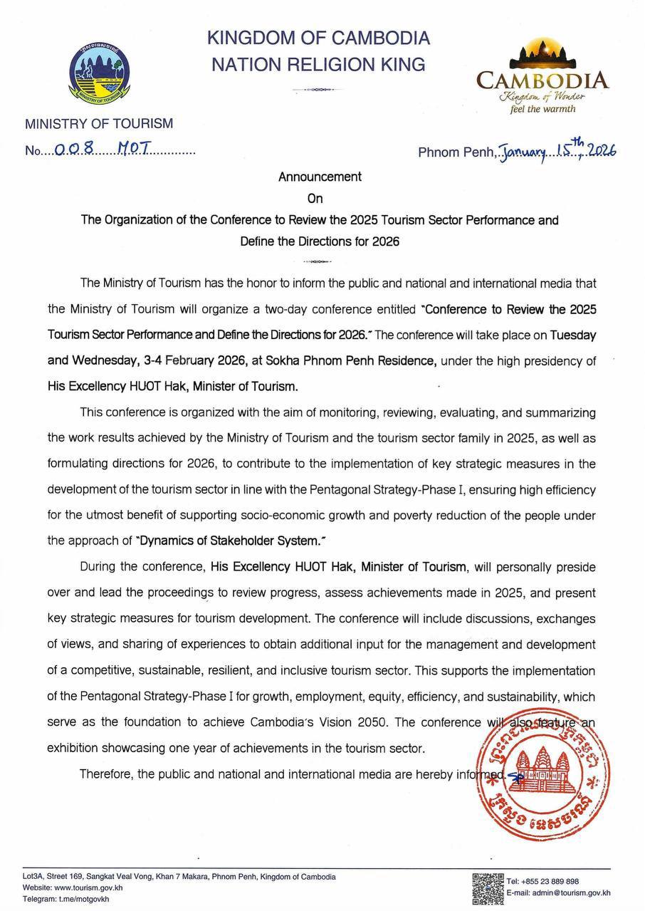ក្រសួងទេសចរណ៍ មានកិត្តិយសសូមជម្រាបជូនដល់សាធារណជន និងសារព័ត៌មានជាតិ-អន្តរជាតិ ឱ្យបាន ជ្រាបថា ក្រសួងទេសចរណ៍នឹងរៀបចំ “សន្និបាតបូកសរុបលទ្ធផលការងារវិស័យទេសចរណ៍ឆ្នាំ២០២៥ និងលើក ទិសដៅការងារឆ្នាំ២០២៦” រយៈពេល ២ថ្ងៃ ដែលនឹងប្រព្រឹត្តទៅនៅថ្ងៃអង្គារ-ពុធ ១រោច-២រោច ខែមាឃ ឆ្នាំម្សាញ់ សប្តស័ក ព.ស.២៥៦៩ ត្រូវនឹងថ្ងៃទី៣-៤ ខែកុម្ភៈ ឆ្នាំ២០២៦ នៅសណ្ឋាគាររ៉េស៊ីដង់ សុខាភ្នំពេញ ក្រោមអធិបតីភាពដ៏ខ្ពង់ខ្ពស់ ឯកឧត្តម ហួត ហាក់ រដ្ឋមន្ត្រីក្រសួងទេសចរណ៍។ សន្និបាតនេះរៀបចំឡើងក្នុងគោលបំណង តាមដាន ត្រួតពិនិត្យ វាយតម្លៃ និងបូកសរុបលទ្ធផលការងារ ដែលក្រសួងទេសចរណ៍ និងមហាគ្រួសារវិស័យទេសចរណ៍ សម្រេចបានក្នុងឆ្នាំ២០២៥ និងលើកទិសដៅ ការងារបន្តឆ្នាំ២០២៦ សំដៅរួមចំណែកអនុវត្តវិធានការគន្លឹះក្នុងការអភិវឌ្ឍវិស័យទេសចរណ៍ ស្របតាមយុទ្ធសាស្ត្រ បញ្ចកោណ-ដំណាក់កាលទី១ ឱ្យទទួលបានប្រសិទ្ធភាពខ្ពស់ ដើម្បីជាឧត្តមប្រយោជន៍ក្នុងការទ្រទ្រង់កំណើន សេដ្ឋកិច្ច-សង្គម និងកាត់បន្ថយភាពក្រីក្ររបស់ប្រជាពលរដ្ឋក្រោមអភិក្រម “ជវភាពនៃប្រព័ន្ធតួអង្គតែមួយ”។ នៅក្នុងដំណើរការនៃអង្គសន្និបាត ឯកឧត្តម ហួត ហាក់ រដ្ឋមន្ត្រីក្រសួងទេសចរណ៍ នឹងដឹកនាំពិធីនេះ ដោយផ្ទាល់ដើម្បីពិនិត្យអំពីវឌ្ឍនភាព វាយតម្លៃលើលទ្ធផលការងារសម្រេចបានក្នុងឆ្នាំ២០២៥ កន្លងទៅ និង លើកឡើងអំពីវិធានការគន្លឹះក្នុងការអភិវឌ្ឍវិស័យទេសចរណ៍ ដោយមានកិច្ចពិភាក្សា ការផ្លាស់ប្តូរមតិយោបល់ និង បទពិសោធ ដើម្បីទទួលបាននូវធាតុចូលថ្មីបន្ថែមក្នុងការគ្រប់គ្រង និងការអភិវឌ្ឍវិស័យទេសចរណ៍ ប្រកបដោយ ភាពប្រកួតប្រជែង ចីរភាព ភាពធន់ និងបរិយាបន្ន សំដៅជំរុញការអនុវត្តយុទ្ធសាស្ត្របញ្ចកោណ ដំណាក់កាលទី១ ដើម្បីកំណើន ការងារ សមធម៌ ប្រសិទ្ធភាព និងចីរភាព ដែលជាគ្រឹះនិងជាមធ្យោបាយដ៏សំខាន់នៃការសម្រេចបាន ចក្ខុវិស័យកម្ពុជាឆ្នាំ២០៥០។ អង្គសន្និបាតក៏នឹងមានការដាក់តាំងបង្ហាញពិព័រណ៍សមិទ្ធផលការងាររយៈពេល ១ឆ្នាំ ក្នុងវិស័យទេសចរណ៍ផងដែរ។ អាស្រ័យហេតុនេះ សូមសាធារណជន និងសារព័ត៌មានជាតិ អន្តរជាតិជ្រាបជាព័ត៌មាន។