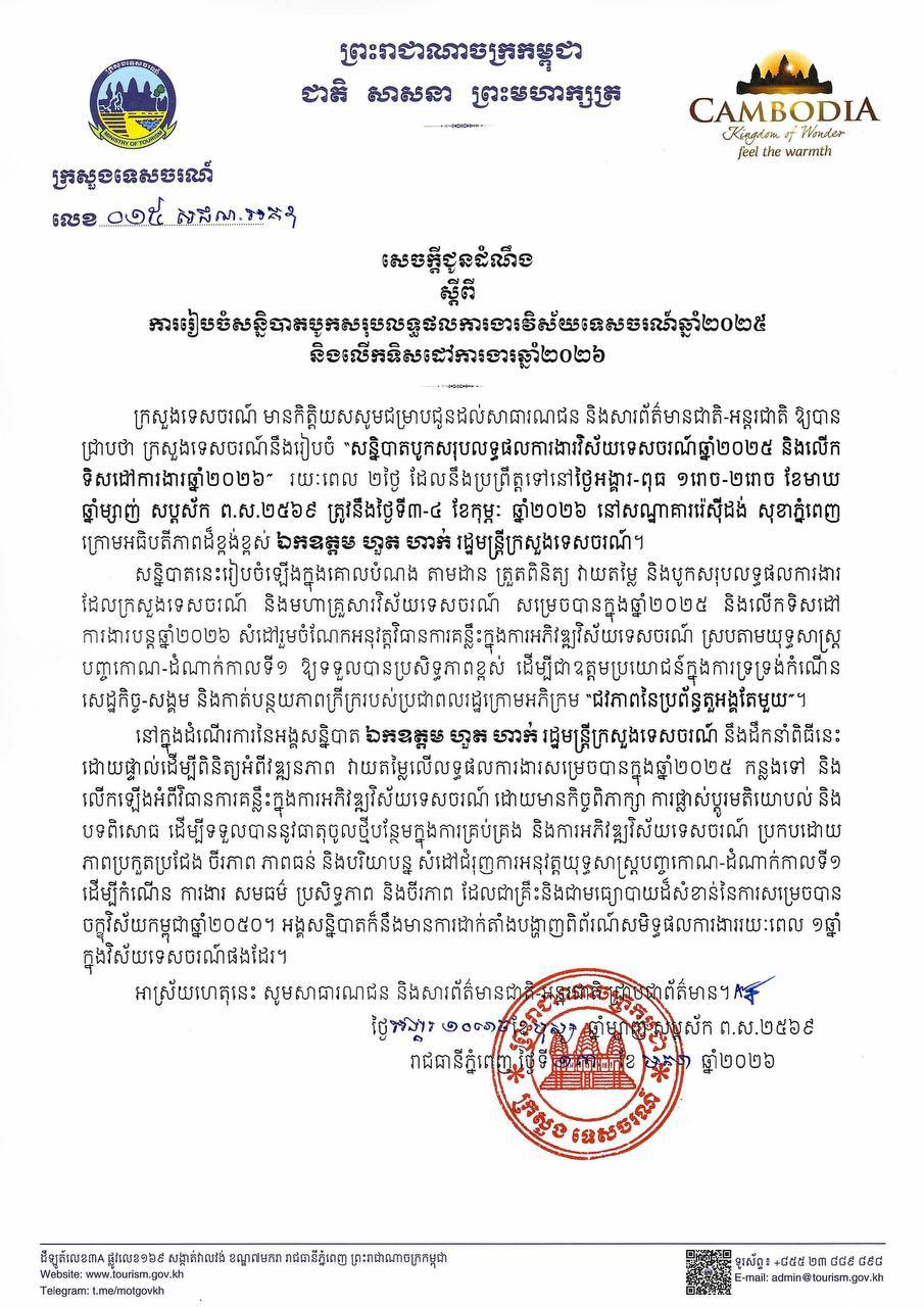 សេចក្តីជូនដំណឹង ស្តីពីការរៀបចំសន្និបាតបូកសរុបលទ្ធផលការងារវិស័យទេសចរណ៍ឆ្នាំ២០២៥ និងលើកទិសដៅការងារឆ្នាំ២០២៦ដែលមានខ្លឹមសារដូចតទៅ