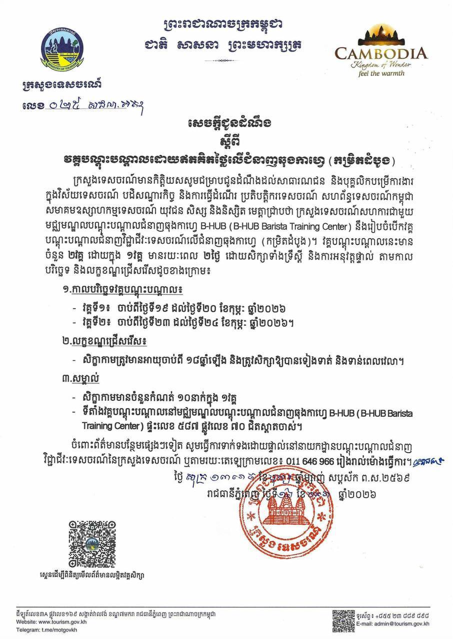 ក្រសួងទេសចរណ៍មានកិត្តិយសសូមជម្រាបជូនដំណឹងដល់សាធារណជន និងបុគ្គលិកបម្រើការងារ ក្នុងវិស័យទេសចរណ៍ បដិសណ្ឋារកិច្ច និងការធ្វើដំណើរ ប្រតិបត្តិករទេសចរណ៍ សហព័ន្ធទេសចរណ៍កម្ពុជា សមាគមឧស្សាហកម្មទេសចរណ៍ យុវជន សិស្ស និងនិស្សិត មេត្តាជ្រាបថា ក្រសួងទេសចរណ៍សហការជាមួយ មជ្ឈមណ្ឌលបណ្តុះបណ្តាលជំនាញឆុងកាហ្វេ B-HUB (B-HUB Barista Training Center) នឹងរៀបចំបើកវគ្គ បណ្តុះបណ្តាលជំនាញវិជ្ជាជីវៈទេសចរណ៍លើជំនាញឆុងកាហ្វេ (កម្រិតដំបូង)។ វគ្គបណ្តុះបណ្តាលនេះមាន ចំនួន ២វគ្គ ដោយក្នុង ១វគ្គ មានរយៈពេល ២ថ្ងៃ ដោយសិក្សាទាំងទ្រឹស្តី និងការអនុវត្តផ្ទាល់ តាមកាល បរិច្ឆេទ និងលក្ខខណ្ឌជ្រើសរើសដូចខាងក្រោម៖