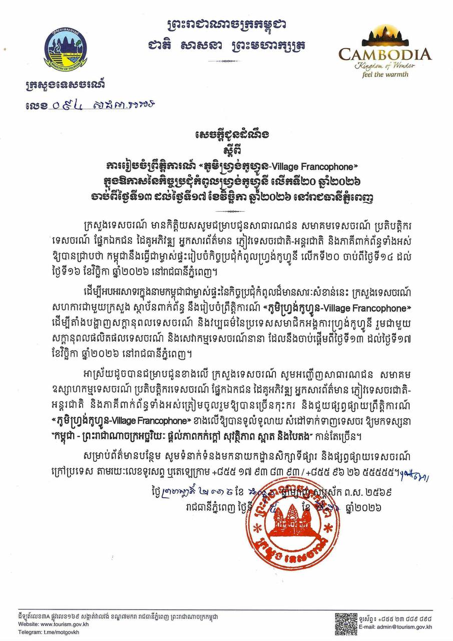សេចក្តីជូនដំណឹង ស្តីពីការរៀបចំព្រឹត្តិការណ៍ «ភូមិហ្វ្រង់កូហ្វូន-Village Francophone» ក្នុងឱកាសនៃកិច្ចប្រជុំកំពូលហ្វ្រង់កូហ្វូនី លើកទី២០ ឆ្នាំ២០២៦ ចាប់ពីថ្ងៃទី១៣ ដល់ថ្ងៃទី១៧ ខែវិច្ឆិកា ឆ្នាំ២០២៦ នៅរាជធានីភ្នំពេញ