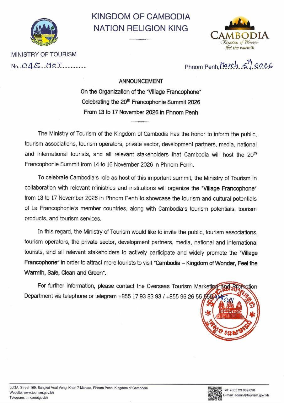 សេចក្តីជូនដំណឹង ស្តីពីការរៀបចំព្រឹត្តិការណ៍ «ភូមិហ្វ្រង់កូហ្វូន-Village Francophone» ក្នុងឱកាសនៃកិច្ចប្រជុំកំពូលហ្វ្រង់កូហ្វូនី លើកទី២០ ឆ្នាំ២០២៦ ចាប់ពីថ្ងៃទី១៣ ដល់ថ្ងៃទី១៧ ខែវិច្ឆិកា ឆ្នាំ២០២៦ នៅរាជធានីភ្នំពេញ។