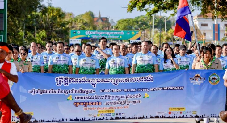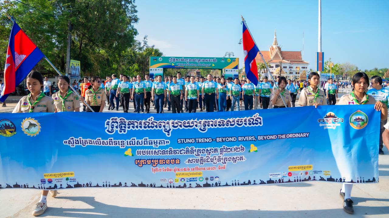 His Excellency HUOT Hak, Minister of Tourism, together with H.E. SOR Soputra, Governor of Stung Treng Province, presided over the opening ceremony of a 3.5-kilometer tourism parade to celebrate National Clean City Day 2026. During the event, the “Stung Treng Provincial Tourism Development Plan 2026–2030” was officially launched, along with the introduction of the new tourism branding “Stung Treng – Beyond the River, Beyond the Ordinary,” in a very festive and vibrant atmosphere.