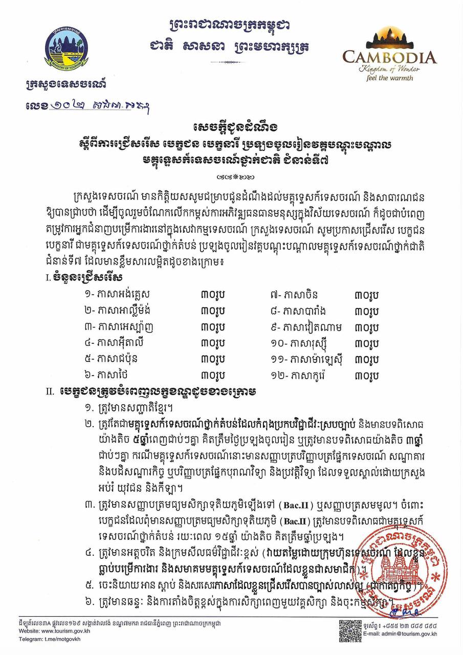 ក្រសួងទេសចរណ៍ប្រកាសជ្រើសរើសមគ្គុទ្ទេសក៍ទេសចរណ៍ថ្នាក់តំបន់ចូលរៀនវគ្គបណ្តុះបណ្តាលមគ្គុទ្ទេសក៍ទេសចរណ៍ថ្នាក់ជាតិ!
