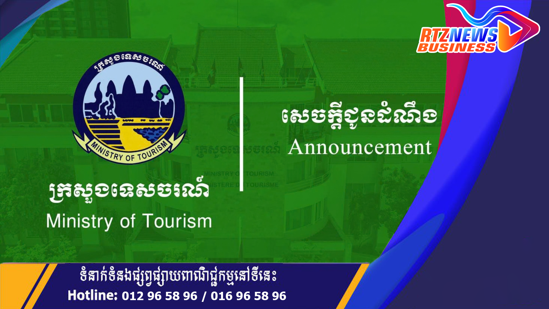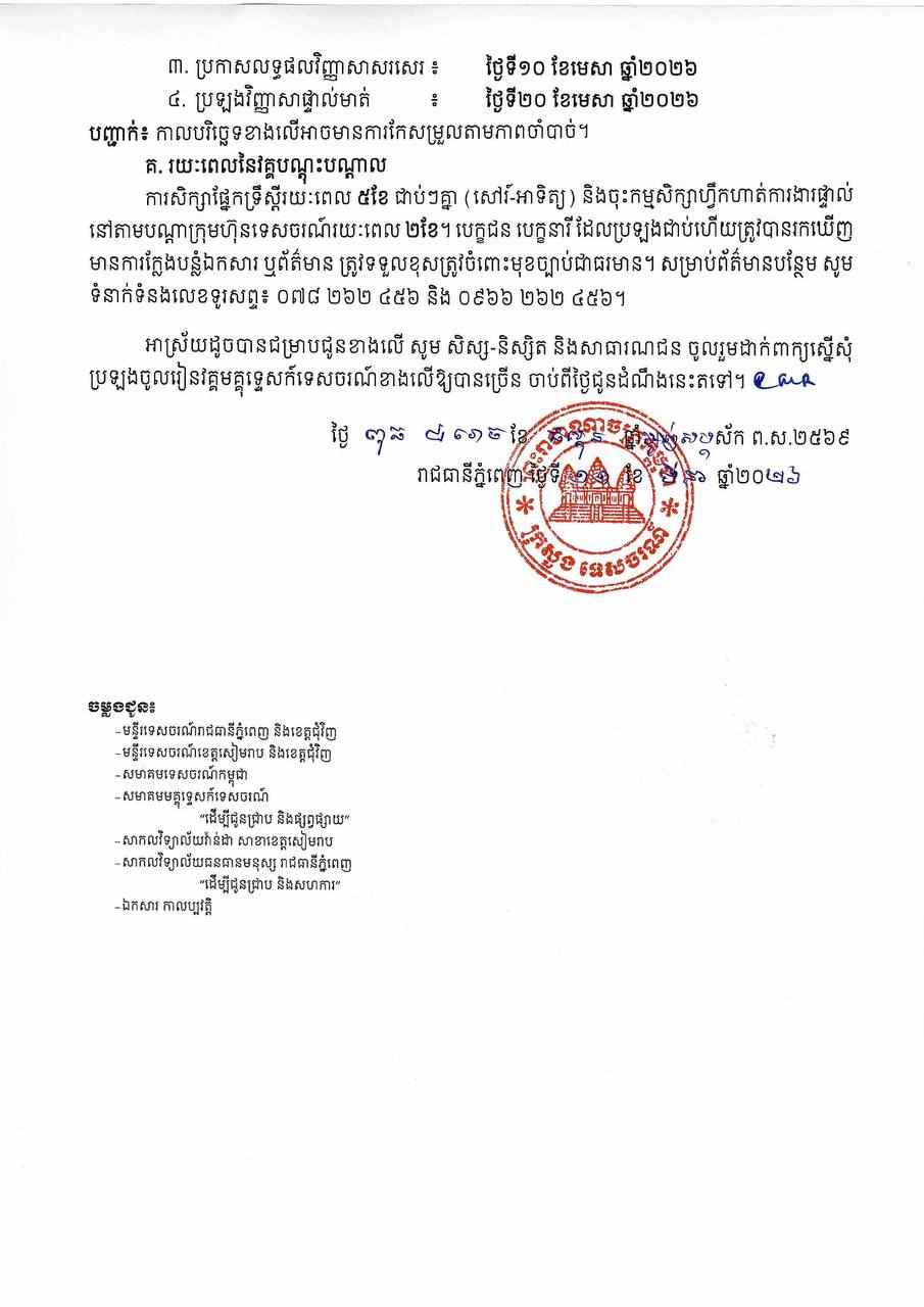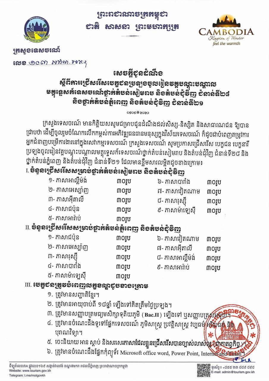 ក្រសួងទេសចរណ៍ប្រកាសជ្រើសរើសសិស្ស-និស្សិត និងអ្នកកំពុងបម្រើការងារក្នុងវិស័យទេសចរណ៍ ចូលរៀនវគ្គបណ្តុះបណ្តាលមគ្គុទ្ទេសក៍ទេសចរណ៍ថ្នាក់តំបន់!