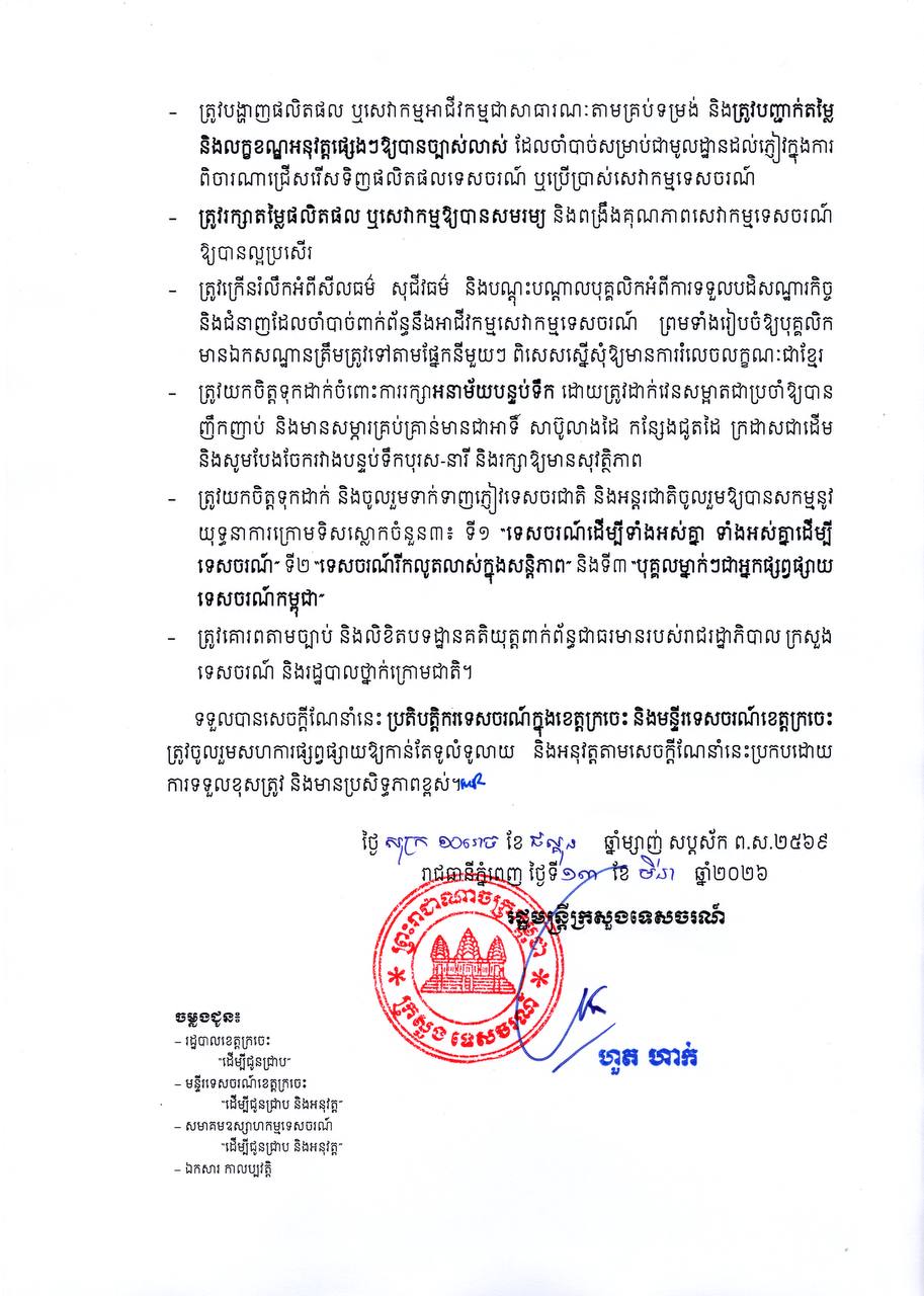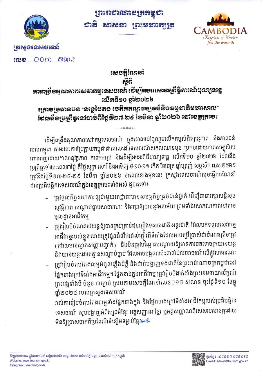 សេចក្តីណែនាំស្តីពីការពង្រឹងគុណភាពសេវាកម្មទេសចរណ៍ ដើម្បីអបអរសាទរព្រឹត្តិការណ៍បុណ្យទន្លេ លើកទី១០ ឆ្នាំ២០២៦ ក្រោមប្រធានបទ “ទន្លេបៃតង បេតិកភណ្ឌវប្បធម៌ និងធម្មជាតិមហាសាល” ដែលនឹងប្រព្រឹត្តទៅចាប់ពីថ្ងៃទី២៧-២៩ ខែមីនា ឆ្នាំ២០២៦ នៅខេត្តក្រចេះ។