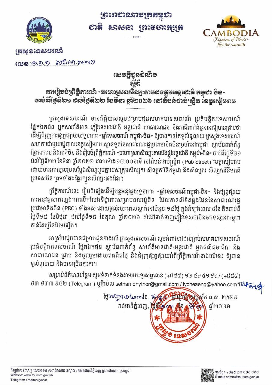 សេចក្តីជូនដំណឹងស្តីពីការរៀបចំព្រឹត្តិការណ៍ «មហោស្រពសិល្បៈតាមដងផ្លូវអន្តរជាតិ កម្ពុជា-ចិន» ចាប់ពីថ្ងៃទី២១ ដល់ថ្ងៃទី២២ ខែមីនា ឆ្នាំ២០២៦ នៅតំបន់ផាប់ស្រ្តីត ខេត្តសៀមរាប។