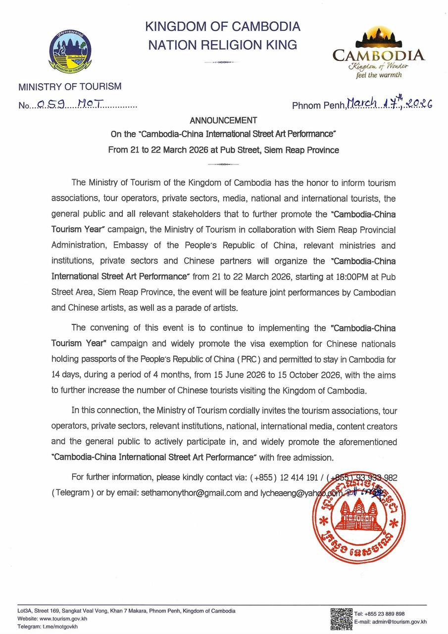 ANNOUNCEMENT On the “Cambodia-China International Street Art Performance” From 21 to 22 March 2026 at Pub Street, Siem Reap Province.