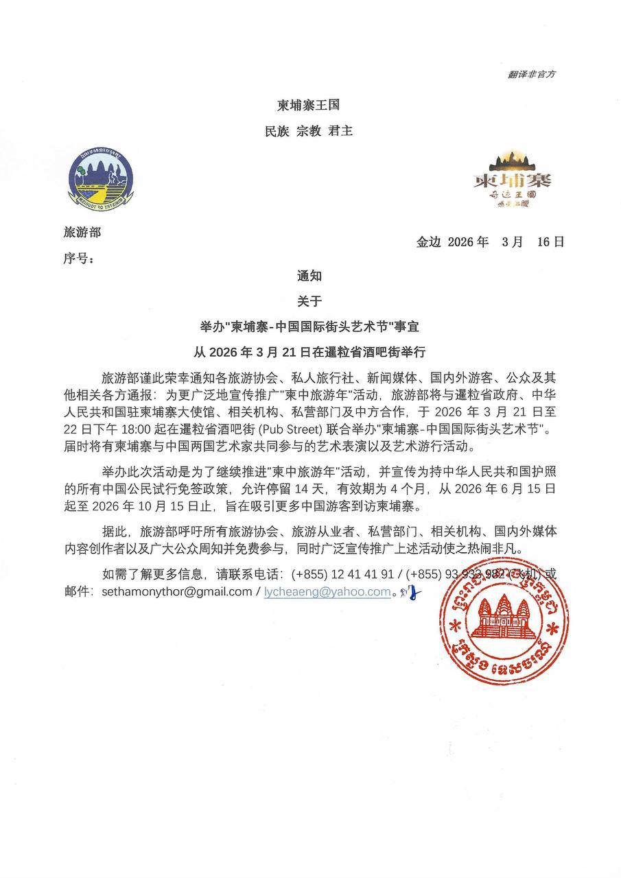 通知 关于 举办”柬埔寨-中国国际街头艺术节”事宜从2026年3月21日在暹粒省酒吧街举行。