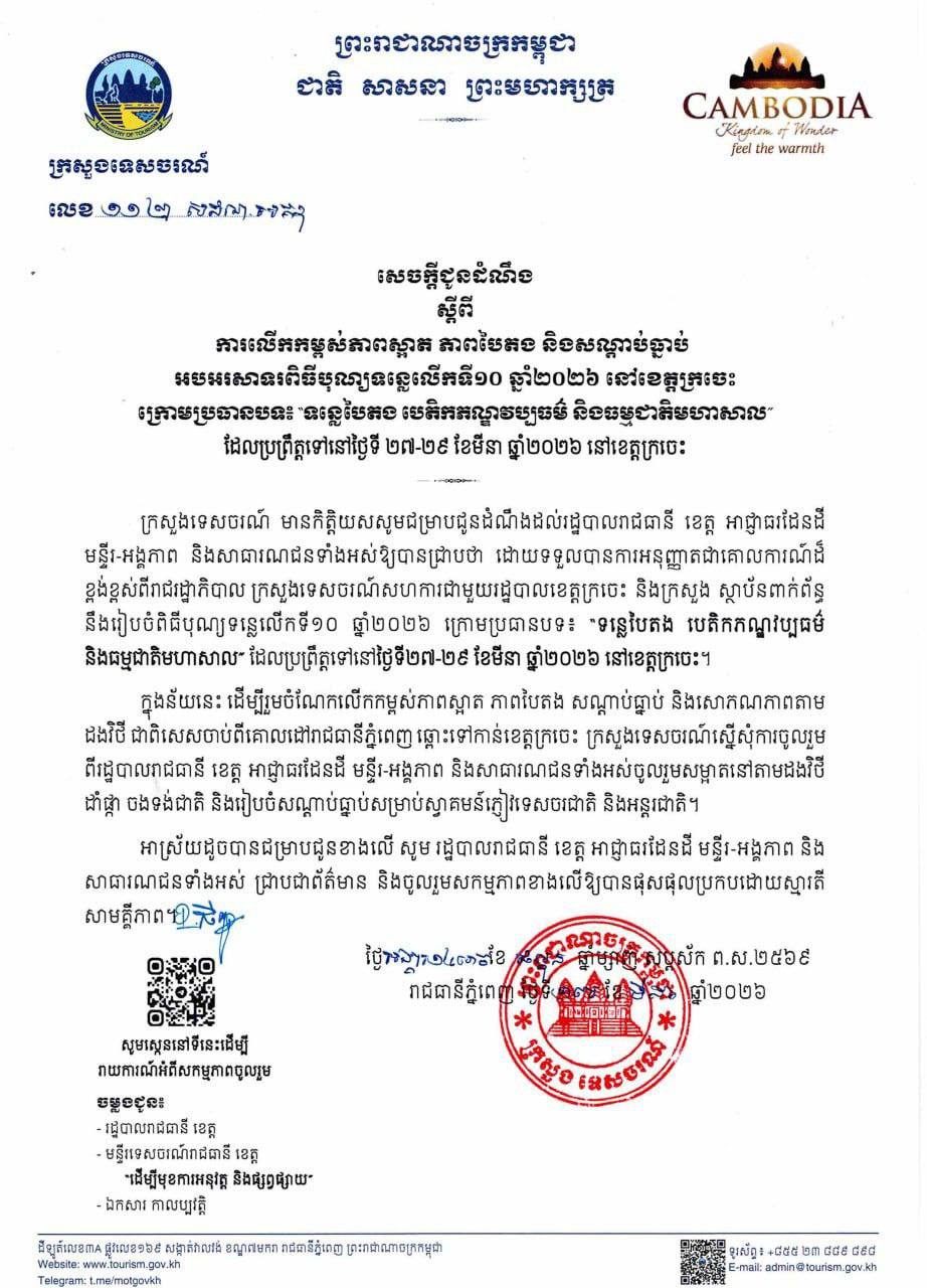 សេចក្តីជូនដំណឹងស្តីពីការលើកកម្ពស់ភាពស្អាត ភាពបៃតង និងសណ្តាប់ធ្នាប់ អបអរសាទរពិធីបុណ្យទន្លេលើកទី១០ ឆ្នាំ២០២៦ នៅខេត្តក្រចេះ