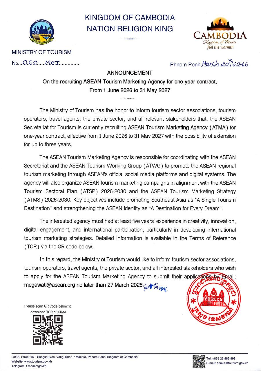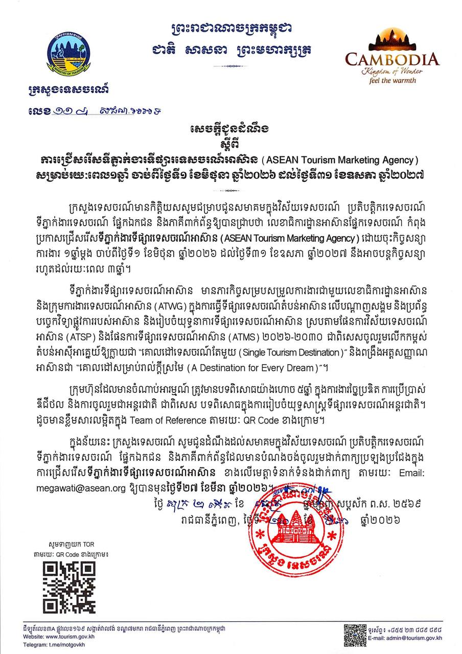 សេចក្តីជូនដំណឹង ស្តីពីការជ្រើសរើសទីភ្នាក់ងារទីផ្សារទេសចរណ៍អាស៊ាន (ASEAN Tourism Marketing Agency) សម្រាប់រយៈពេល១ឆ្នាំ ចាប់ពីថ្ងៃទី១ ខែមិថុនា ឆ្នាំ២០២៦ ដល់ថ្ងៃទី៣១ ខែឧសភា ឆ្នាំ២០២៧។