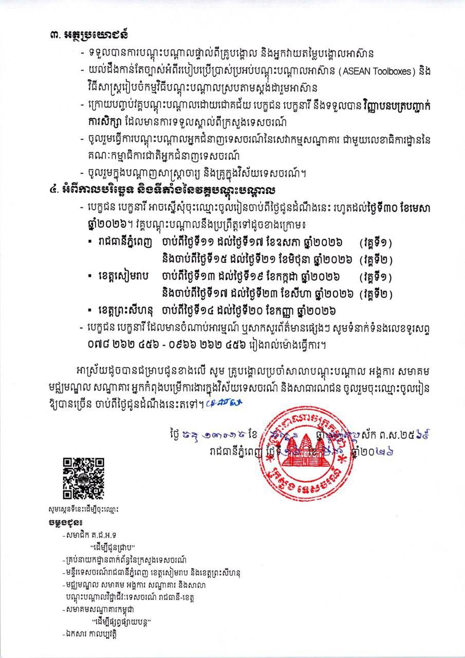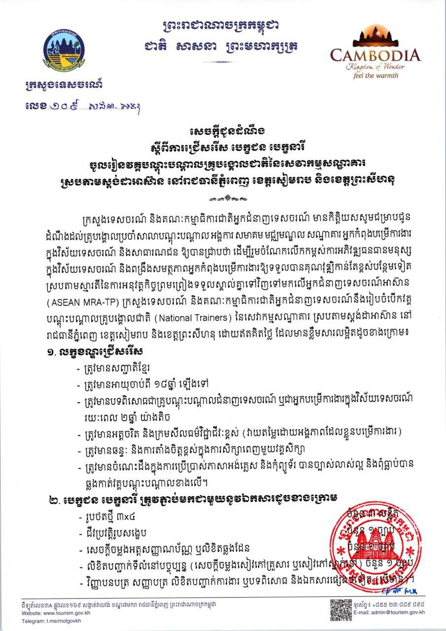 ដើម្បីពង្រឹងសមត្ថភាពអ្នកកំពុងបម្រើការងារនៅក្នុងវិស័យទេសចរណ៍ ឱ្យទទួលបានគុណវុឌ្ឍិកាន់តែខ្ពស់ ព្រមទាំងបំពាក់បំប៉នចំណេះដឹងបន្ថែមអំពីការប្រើប្រាស់ប្រអប់បណ្តុះបណ្តាលអាស៊ាន (ASEAN Toolboxes) និងវិធីសាស្ត្រចងក្រងឯកសារមេរៀន និងការបង្រៀន ស្របតាមស្តង់ដាររួមអាស៊ាន ក្រសួងទេសចរណ៍ សូមលើកទឹកចិត្តដល់គ្រូបង្គោលប្រចាំសាលាបណ្តុះបណ្តាល មជ្ឈមណ្ឌល សមាគម អង្គការ សណ្ឋាគារ និងអ្នកកំពុងបម្រើការងារនៅក្នុងវិស័យទេសចរណ៍ចូលរួមវគ្គបណ្តុះបណ្តាលគ្រូបង្គោលជាតិនៃសេវាកម្មសណ្ឋាគារ (National Trainers) សម្រាប់ឆ្នាំ២០២៦ នៅរាជធានីភ្នំពេញ ខេត្តសៀមរាប និងខេត្តព្រះសីហនុដោយឥតគិតថ្លៃ។