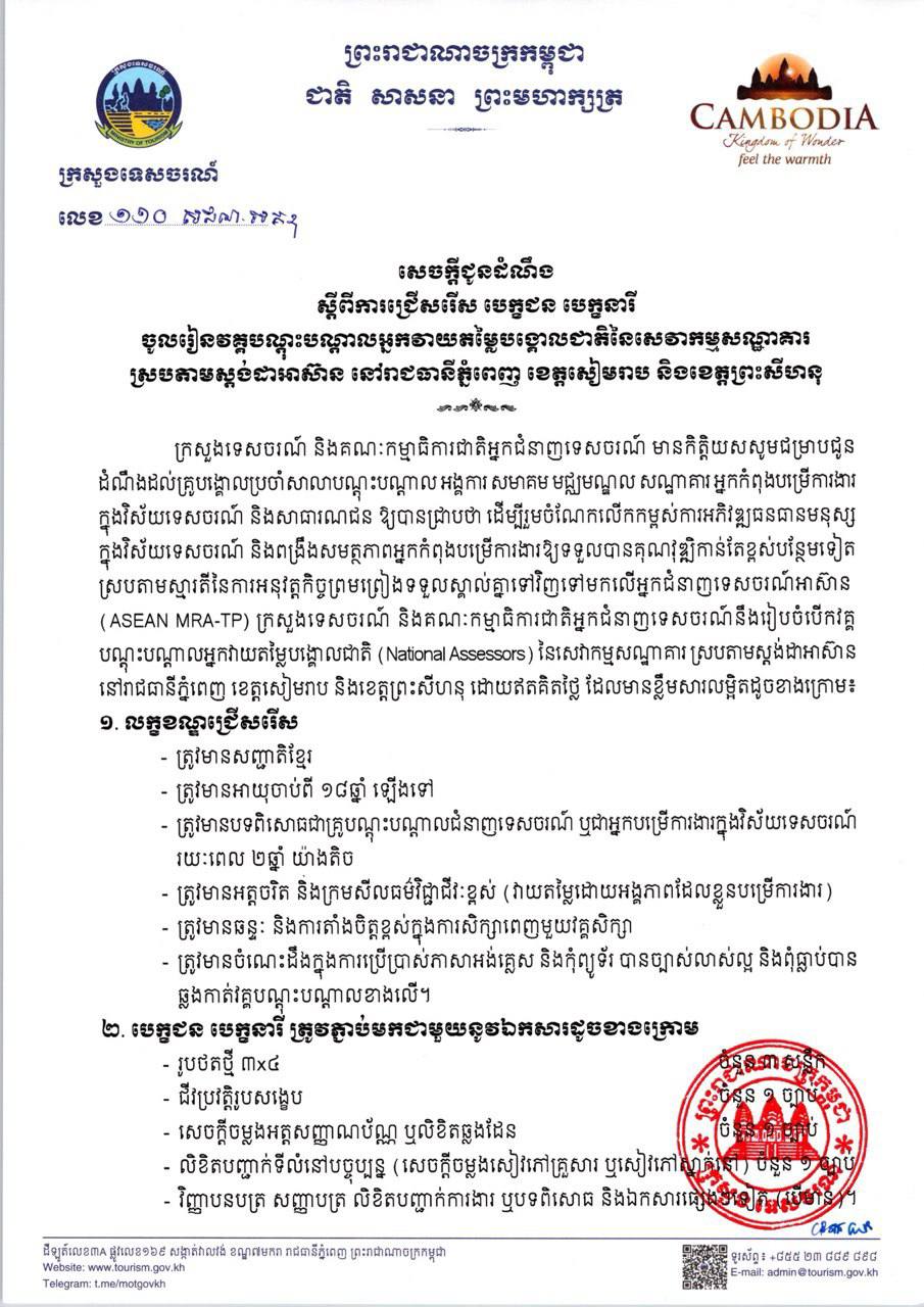 ក្រសួងទេសចរណ៍ ប្រកាសជ្រើសរើសអ្នកកំពុងបម្រើការងារក្នុងវិស័យទេសចរណ៍ ឱ្យចូលរៀនវគ្គបណ្តុះបណ្តាលអ្នកវាយតម្លៃបង្គោលជាតិ ស្របតាមស្តង់ដារអាស៊ាន!
