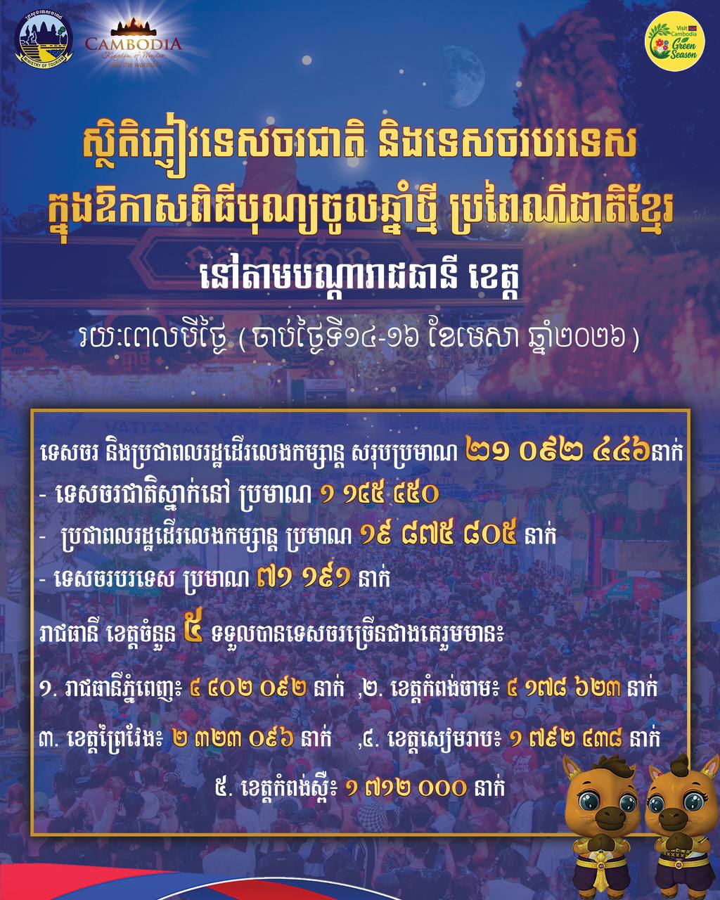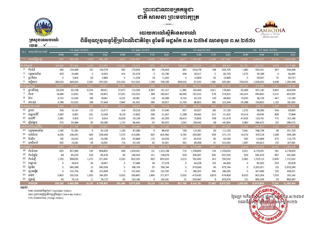Statistics of national and foreign tourists during the Khmer New Year across the capital and provinces throughout the three days (April 14-16, 2026).