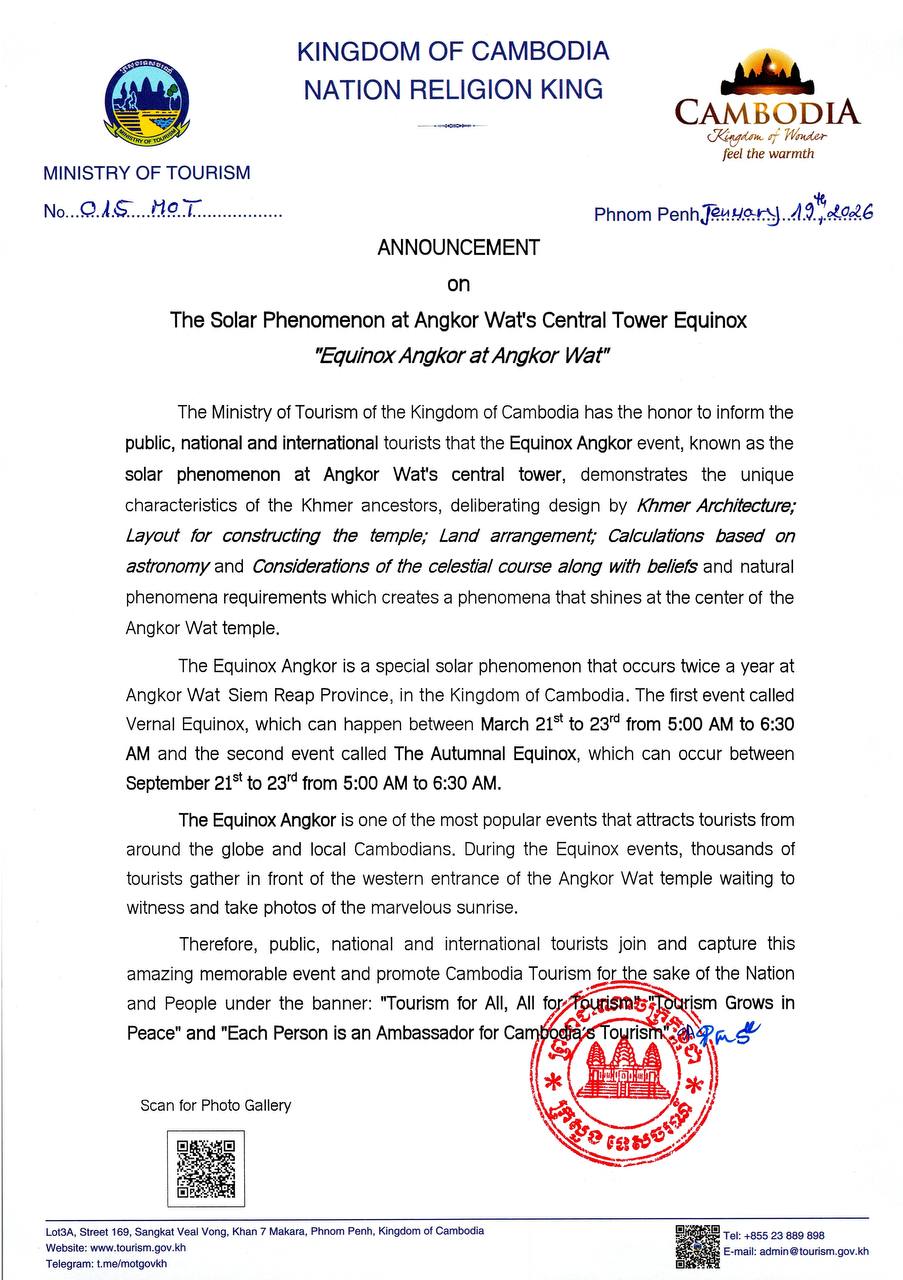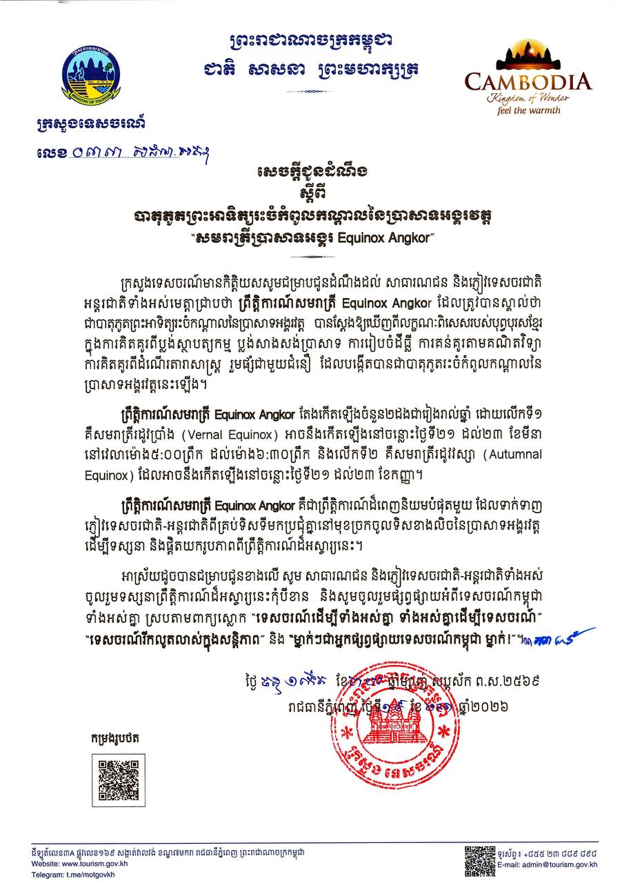 សេចក្តីជូនដំណឹង ស្តីពីបាតុភូតព្រះអាទិត្យរះចំកំពូលកណ្តាលនៃប្រាសាទអង្គរវត្ត «សមរាត្រីប្រាសាទអង្គរ Equinox Angkor»។