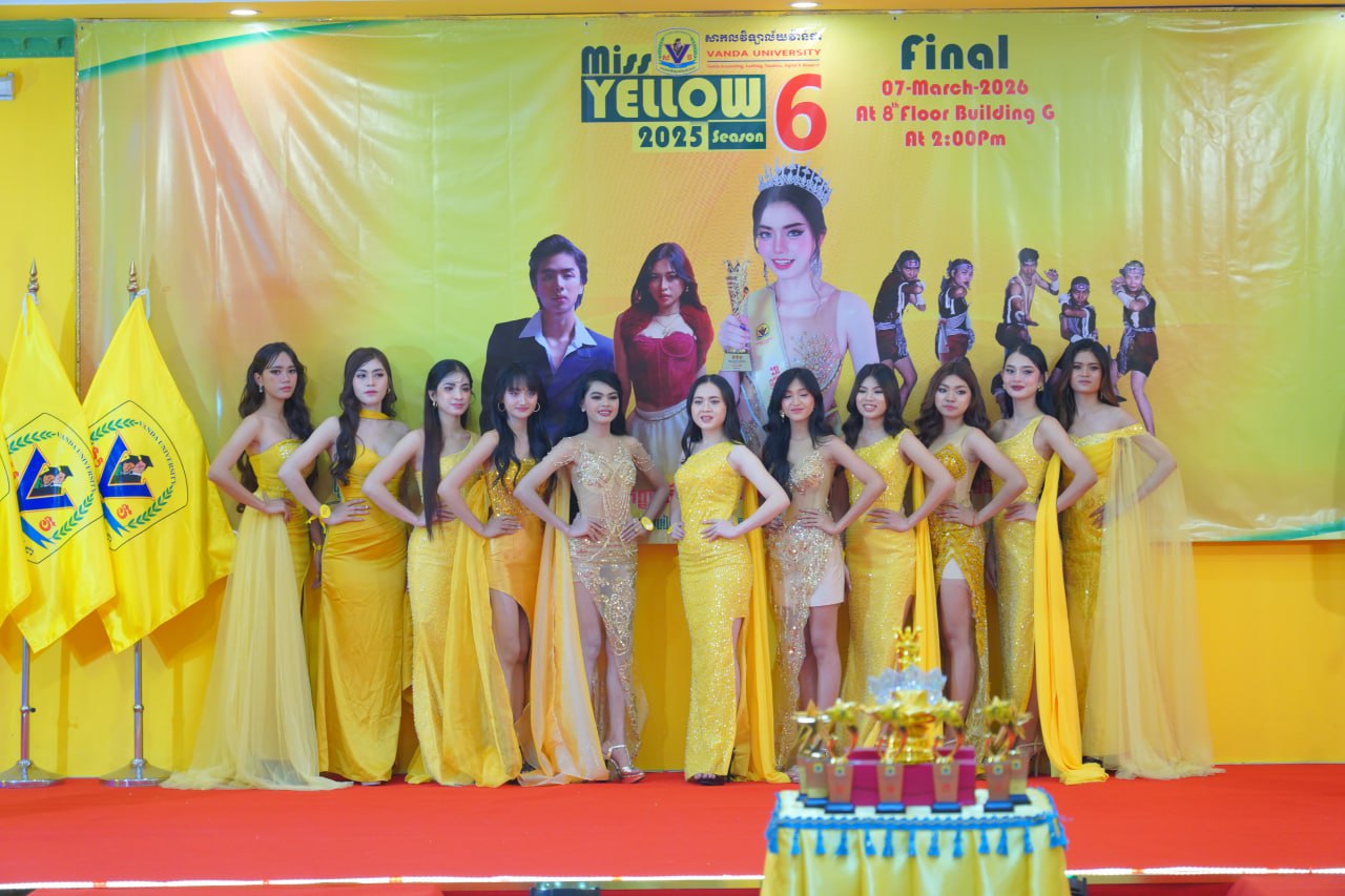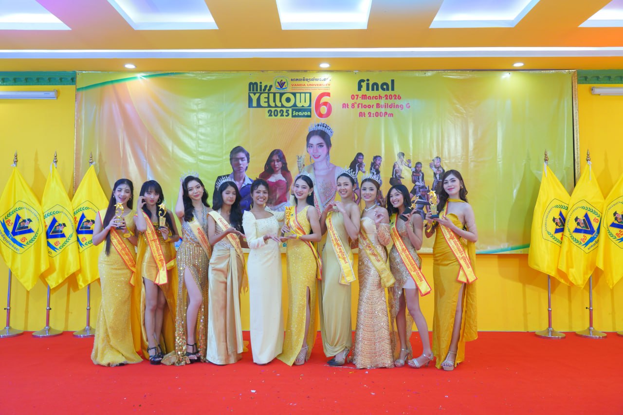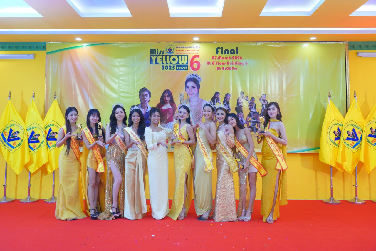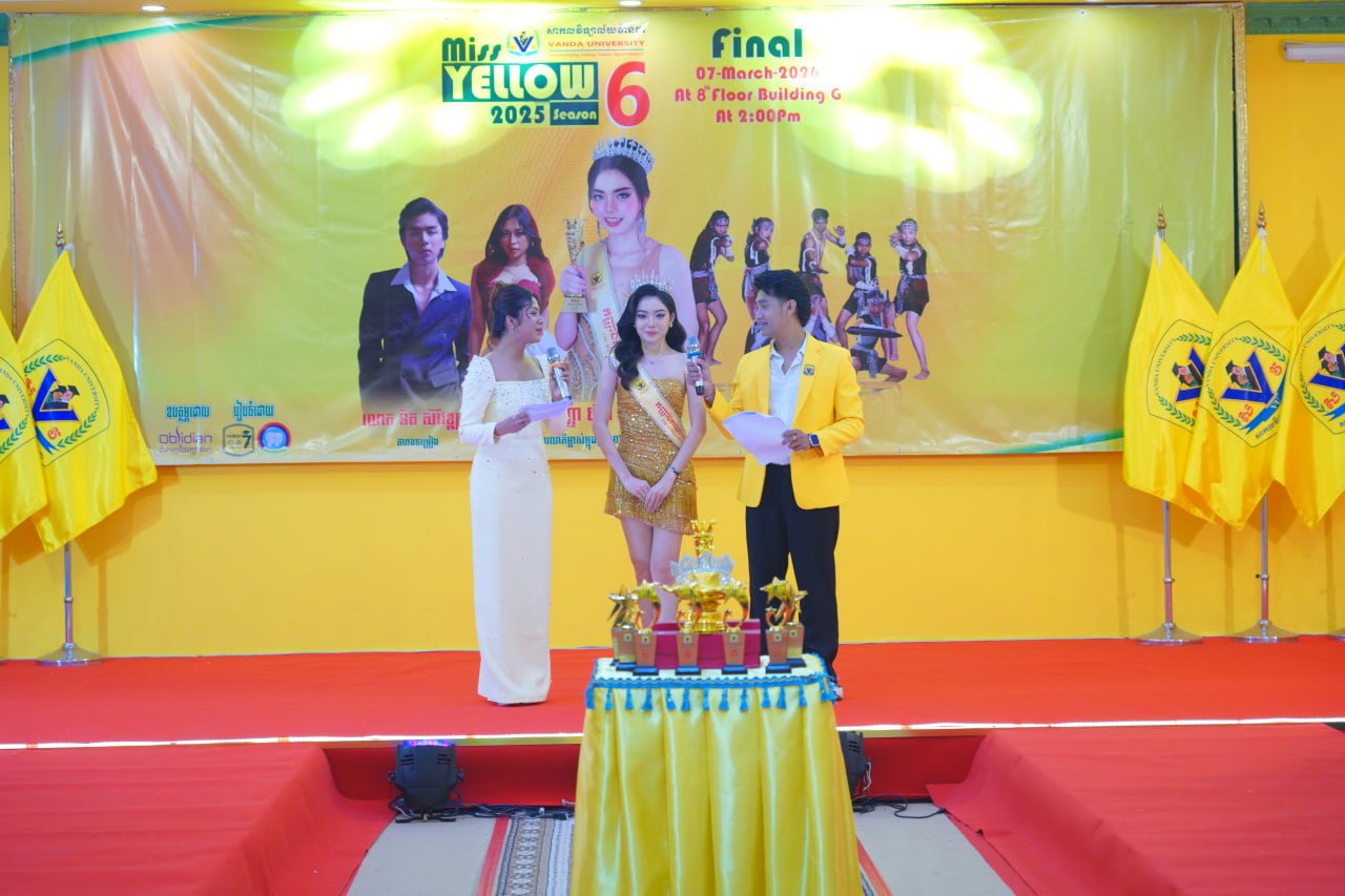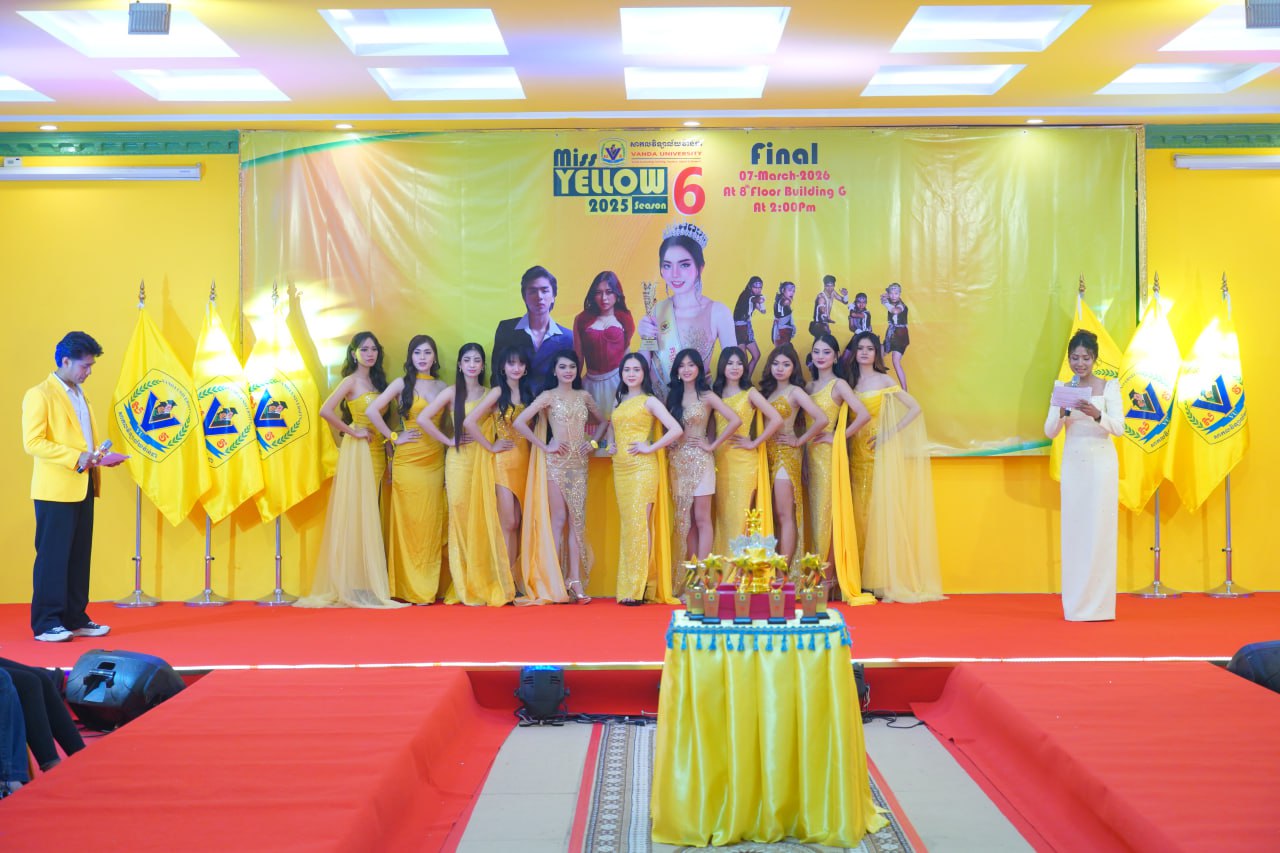 កម្មវិធីប្រកួតប្រជែងកញ្ញាឯកពណ៌លឿង Miss Yellow រដូវកាលទី៦ វគ្គផ្តាច់ព្រ័ត្រ នារសៀលថ្ងៃទី០៧ ខែមីនា ឆ្នាំ២០២៦ ក្រោមអធិបតីភាពដ៏ខ្ពង់ខ្ពស់របស់ ឯកឧត្តមបណ្ឌិត ហេង វ៉ាន់ដា ប្រធានក្រុមប្រឹក្សាភិបាលនៃសាកលវិទ្យាល័យវ៉ាន់ដា និងលោកជំទាវ។