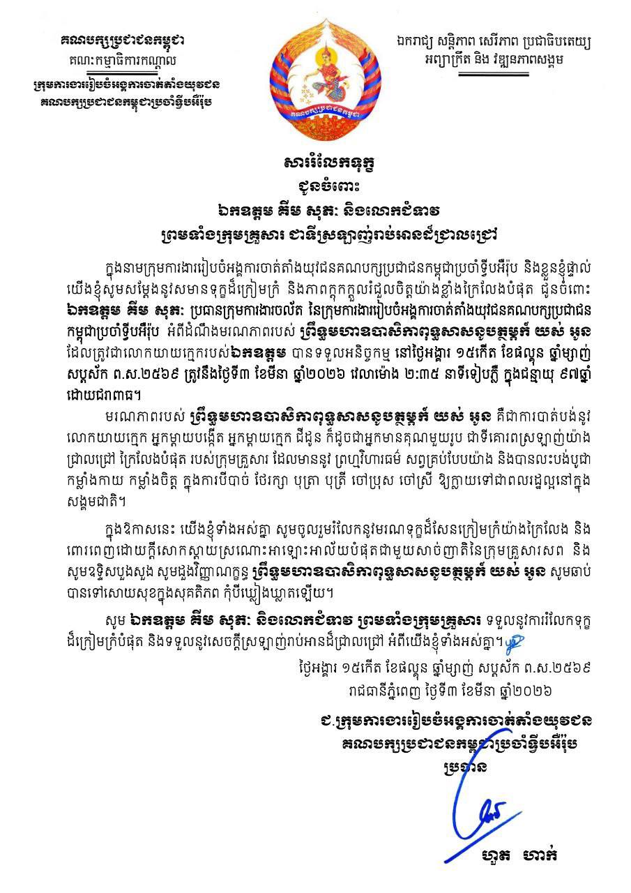 ឯកឧត្តម ហួត ហាក់ សមាជិកគណៈកម្មាធិការកណ្តាល និងជាប្រធានក្រុមការងាររៀបចំអង្គការចាត់តាំងយុវជនគណបក្សប្រជាជនកម្ពុជាប្រចាំទ្វីបអឺរ៉ុប អញ្ជើញដឹកនាំក្រុមការងារ ចូលរួមគោរពវិញ្ញាណក្ខន្ធព្រឹទ្ធមហាឧបាសិកាពុទ្ធសាសនូបត្ថម្ភក៍ យស់ អូន ដែលត្រូវជាលោកយាយក្មេករបស់ឯកឧត្តម គីម សុភៈ សមាជិកគណៈកម្មាធិការកណ្តាល និងជាប្រធានក្រុមការងារចល័ត នៃក្រុមការងាររៀបចំអង្គការចាត់តាំងយុវជនគណបក្សប្រជាជនកម្ពុជាប្រចាំទ្វីបអឺរ៉ុប បានទទួលអនិច្ចកម្មនៅថ្ងៃទី៣ ខែមីនា ឆ្នាំ២០២៦ វេលាម៉ោង ២:៣៥ នាទីទៀបភ្លឺ ក្នុងជន្មាយុ ៩៧ឆ្នាំ ដោយជរាពាធ។