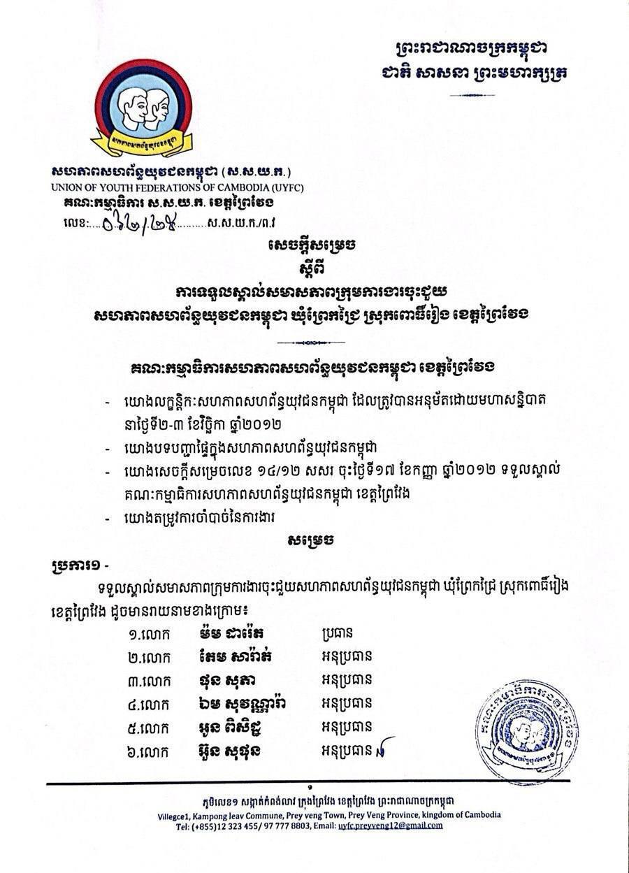 - យោងបទបញ្ជាផ្ទៃក្នុងសហភាពសហព័ន្ធយុវជនកម្ពុជា យោងសេចក្តីសម្រេចលេខ ១៤/១២ សសរ ចុះថ្ងៃទី១៧ ខែកញ្ញា ឆ្នាំ២០១២ ទទួលស្គាល់ គណៈកម្មាធិការសហភាពសហព័ន្ធយុវជនកម្ពុជា ខេត្តព្រៃវែង