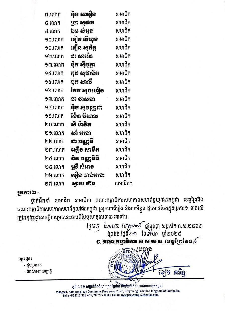 សេចក្តីសម្រេចលេខ : ០៦២/២៥ ស.ស.យ.ក./ព.វ ស្តីពីការទទួលស្គាល់សមាសភាពក្រុមការងារចុះជួយ សហភាពសហពន្ធ័យុវជនកម្ពុជា ឃុំព្រែកជ្រៃ ស្រុកពោធិ៏រៀង ខេត្តព្រៃវែង
