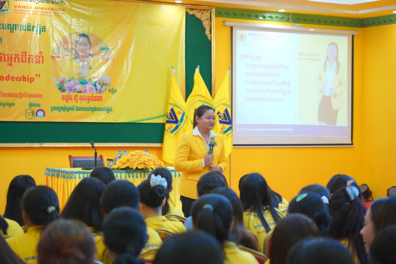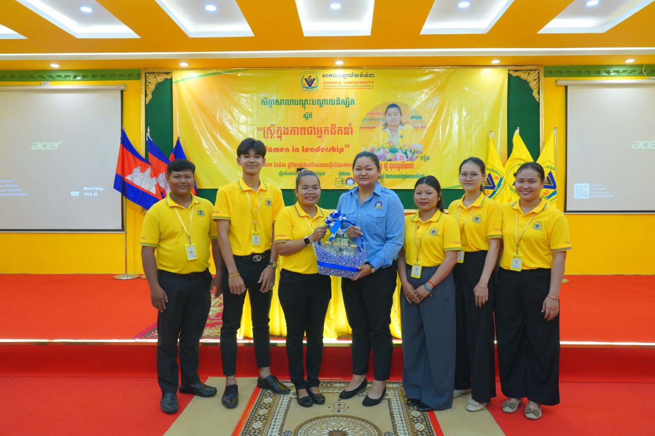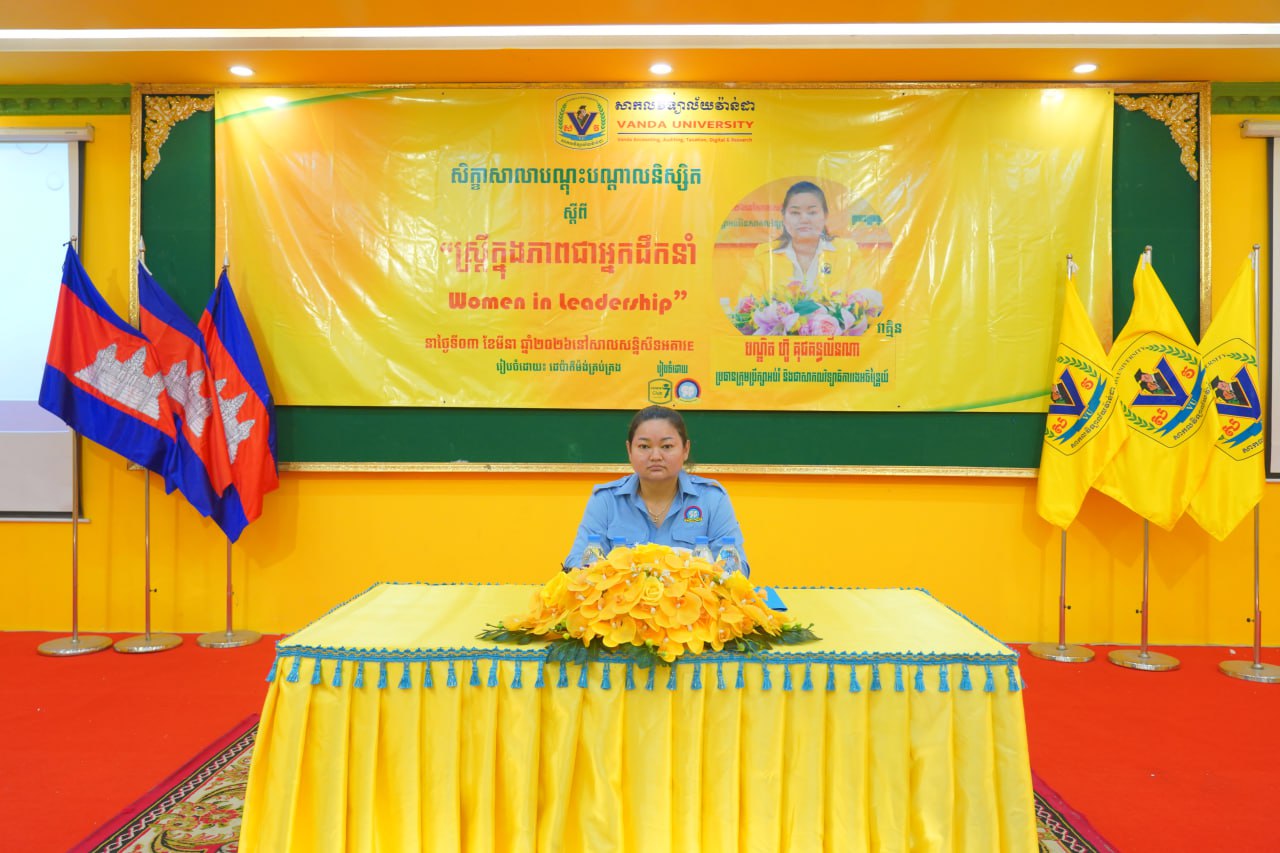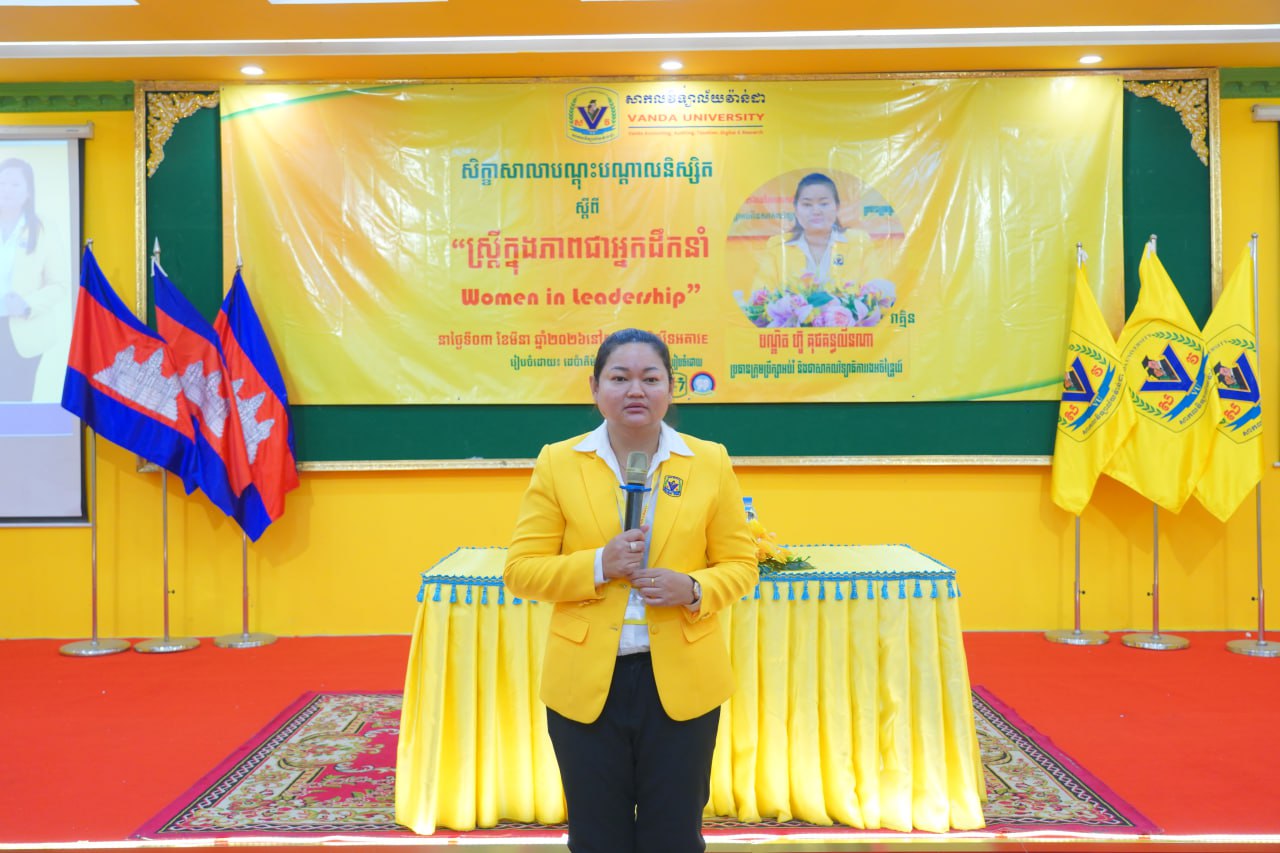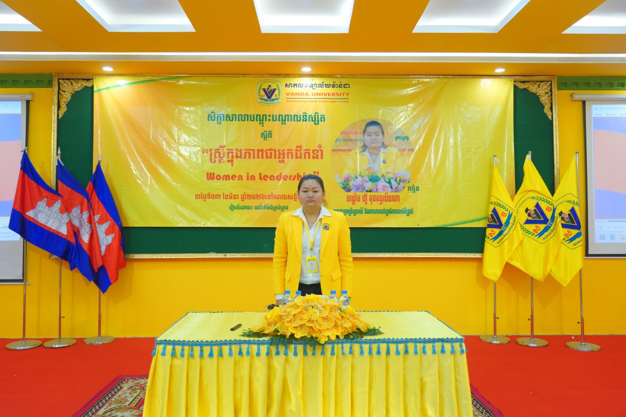 នាព្រឹកថ្ងៃទី០៣ ខែមីនា ឆ្នាំ២០២៦ ដេប៉ាម៉ង់គ្រប់គ្រងនៃមហាវិទ្យាល័យធុរកិច្ច បានរៀបចំសិក្ខាសាលាបណ្តុះបណ្តាលនិស្សិត ស្តីពី “ស្រ្តីក្នុងភាពជាអ្នកដឹកនាំ” វាគ្មិនកត្តិយស បណ្ឌិត ហ៊ូ គុជគន្ធលីនណា ប្រធានក្រុមប្រឹក្សាអប់រំ និងជាសាកលវិទ្យាធិការរងអចិន្រ្តៃយ៍ នៃសាកលវិទ្យាល័យវ៉ាន់ដា ដើម្បីបន្ថែមនូវជំនាញទន់ដល់និស្សិតក្នុងការរៀបចំខ្លួនដើម្បីក្លាយជាអ្នកដឹកនាំស្រ្តីនាថ្ងៃអនាគត។